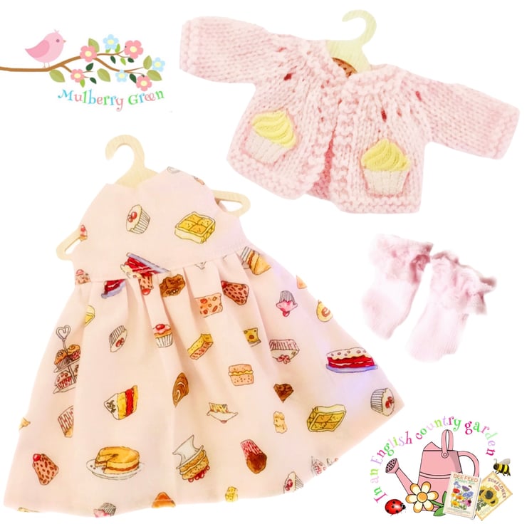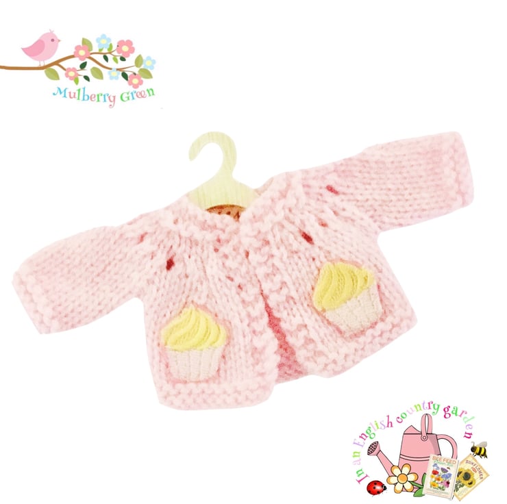 A beautiful little cardigan in pale pink, decorated with 2 cute little embroidered cup cakes to fit the Mulberry Green characters. The cardigan is hand knitted and is part of the English Country Garden collection. It matches the Tea for Two dress. It comes on a cute little wooden hanger.
