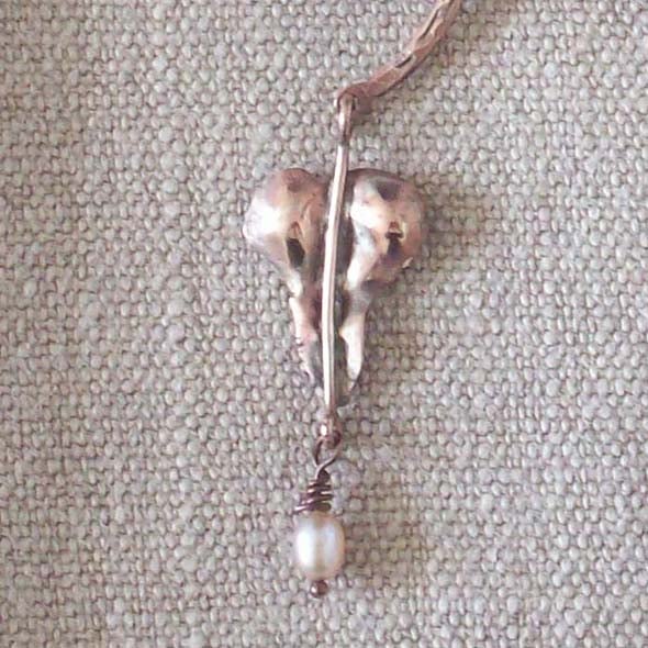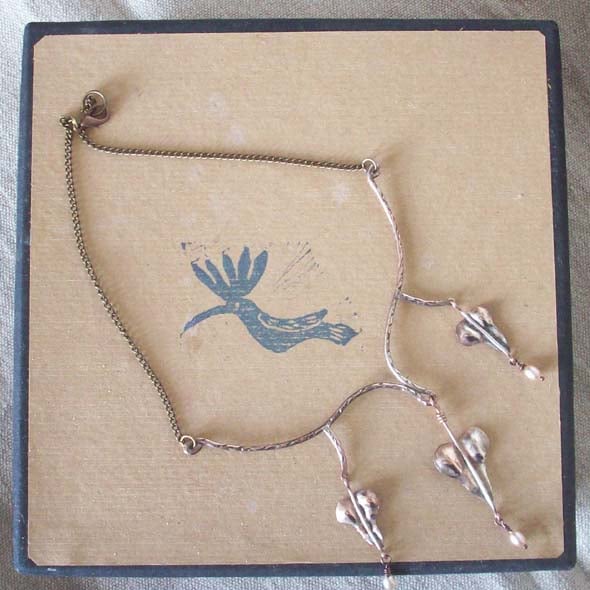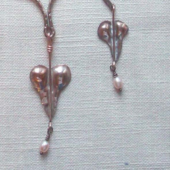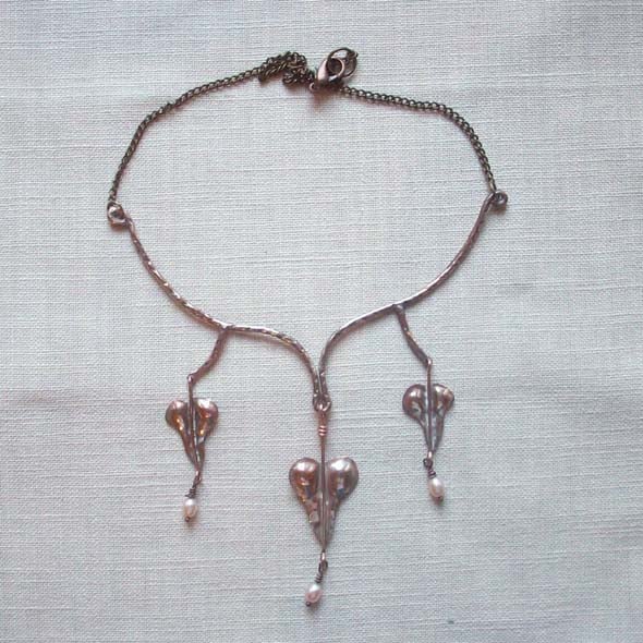 Hand made from sheet and wire using traditional techniques, this pretty necklace has freshwater pearls hanging from the hearts. It is based on the plant Love Lies Bleeding. The hearts have a thin wash of silver for patina. Measures 43 cm long. Please contact me re multiple postage or outside UK as prices vary. There are earrings to match. Thanks for looking and for supporting hand-made!