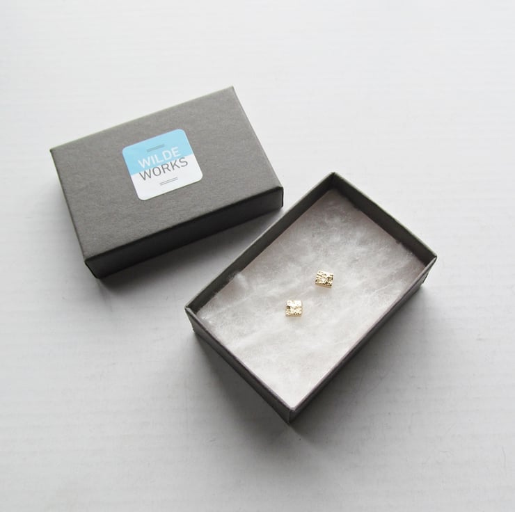 Part of my 'Solid as a Rock' Collection, the little studs measure approximately 4.5x5mm and 4.5x4.5mm and come with 9ct gold scrolls. Each pair is rolled, sawn, carefully hammer-textured and soldered, making each pair unique.