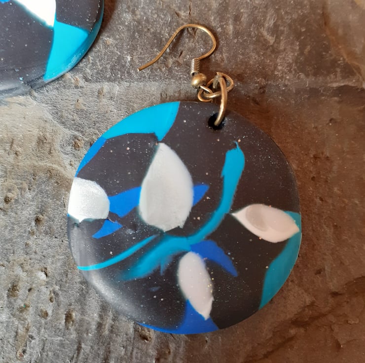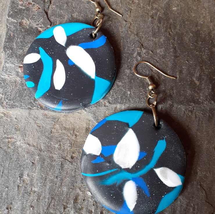 Round earrings inspired by designs from the 1980's, I love all things retro and try to bring into my designs some of the era's that interest me the most, this set are similar but not too matchy matchy. They also have a sparkle to them, there is some in the darker colour of black-blue.They are 42mm long and with the nickel free bronze coloured findings 55mm. And the diameter of the circle is 50mm wide.