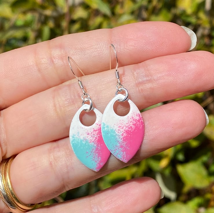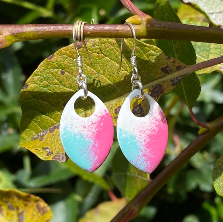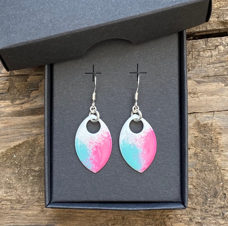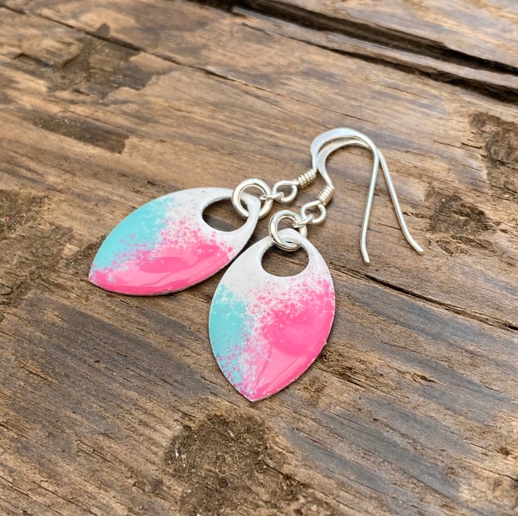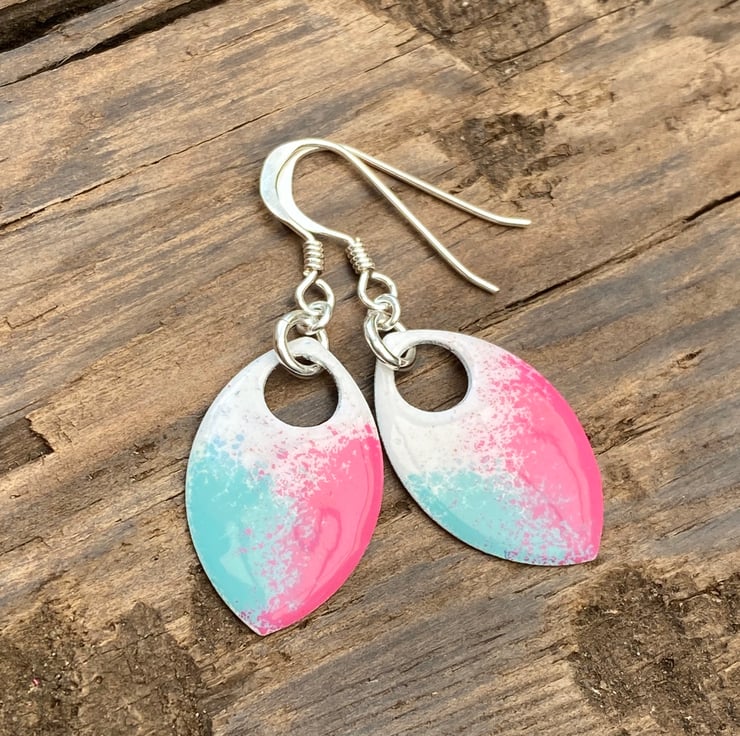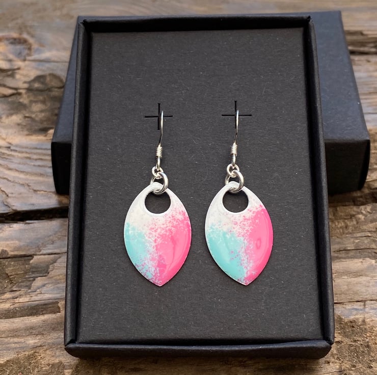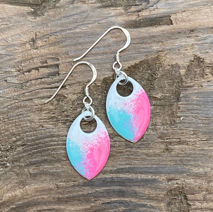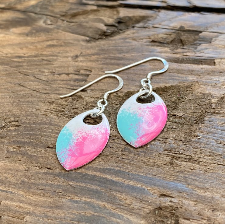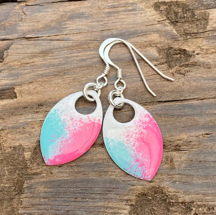 Super light weight aluminium scales have been hand enamelled in a number of layers of cold enamel. These hang from sterling silver fish hook earrings using sterling silver jump rings. The back of the scale remains blank, silver in colour.