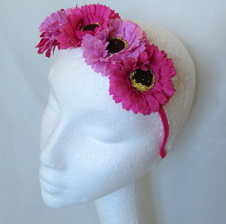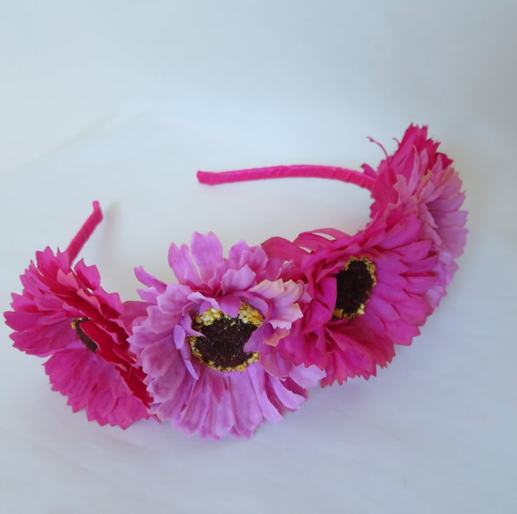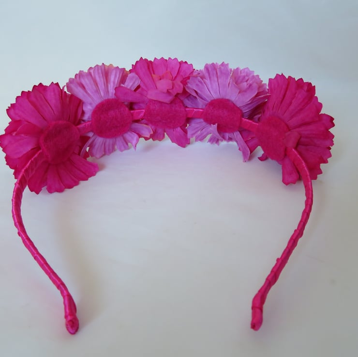 This is a simple and fabulous eye catching artificial flower crown in shades of raspberry cerise pink and lighter fuchsia pink..