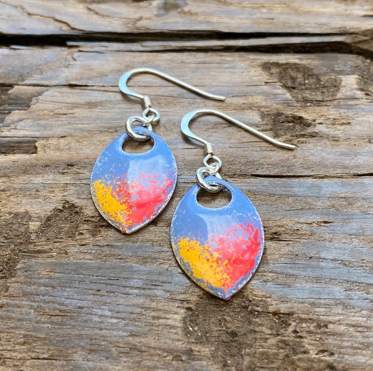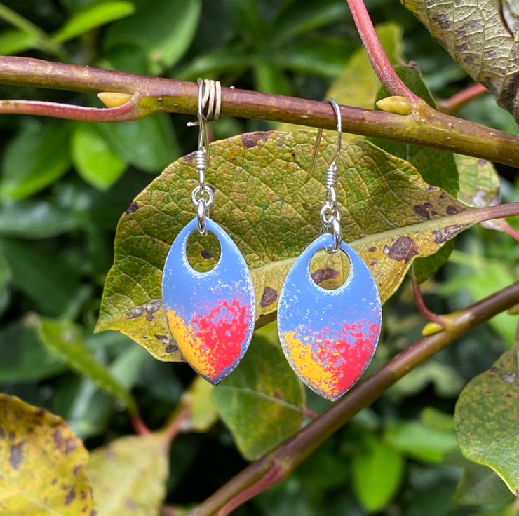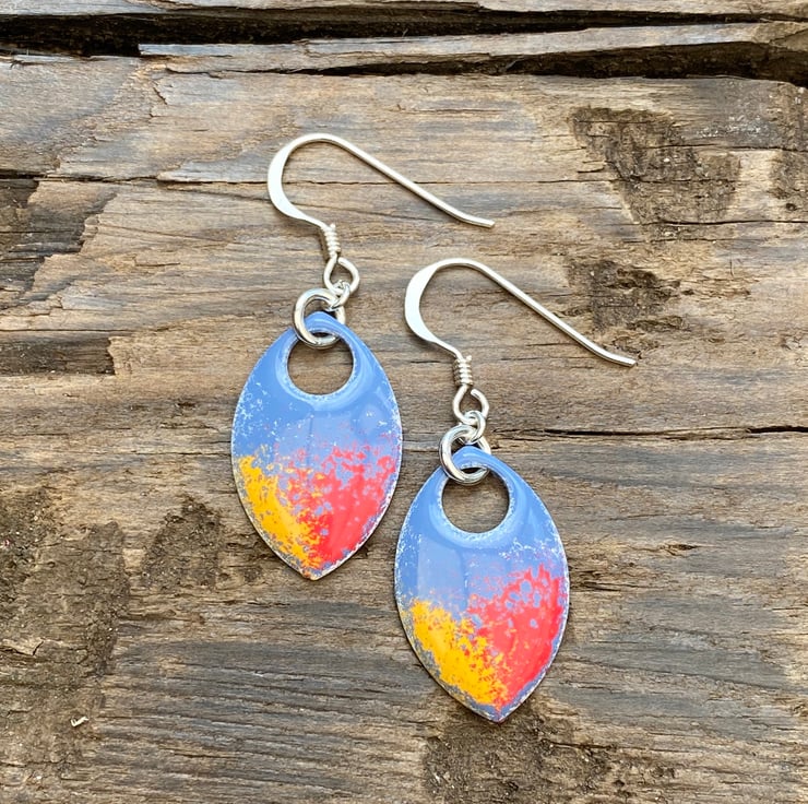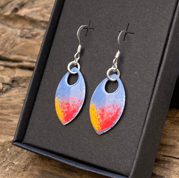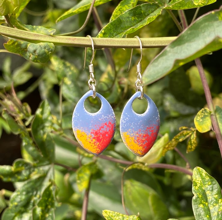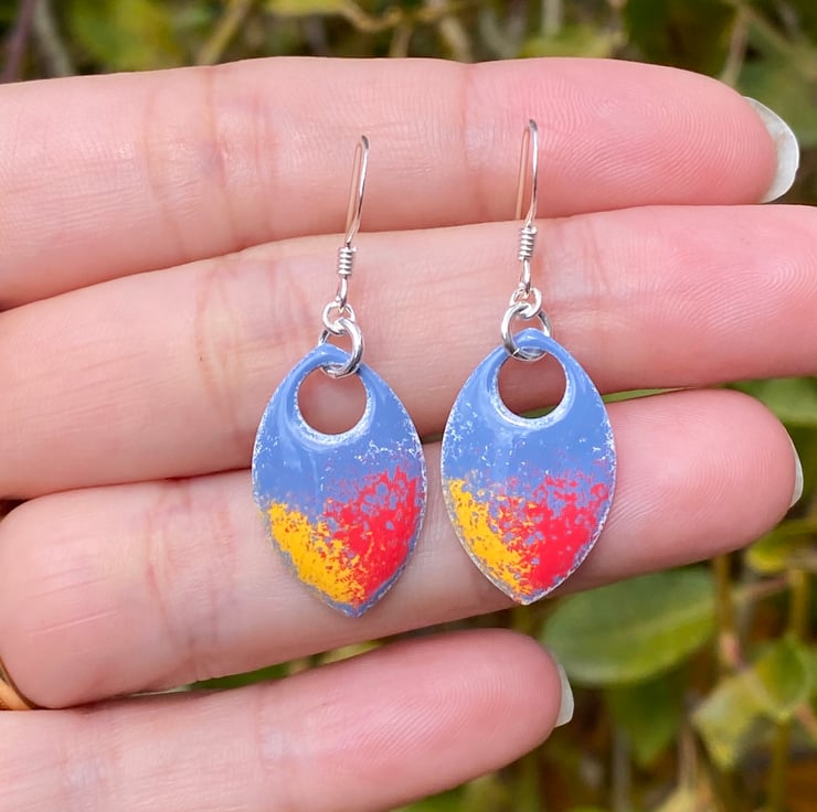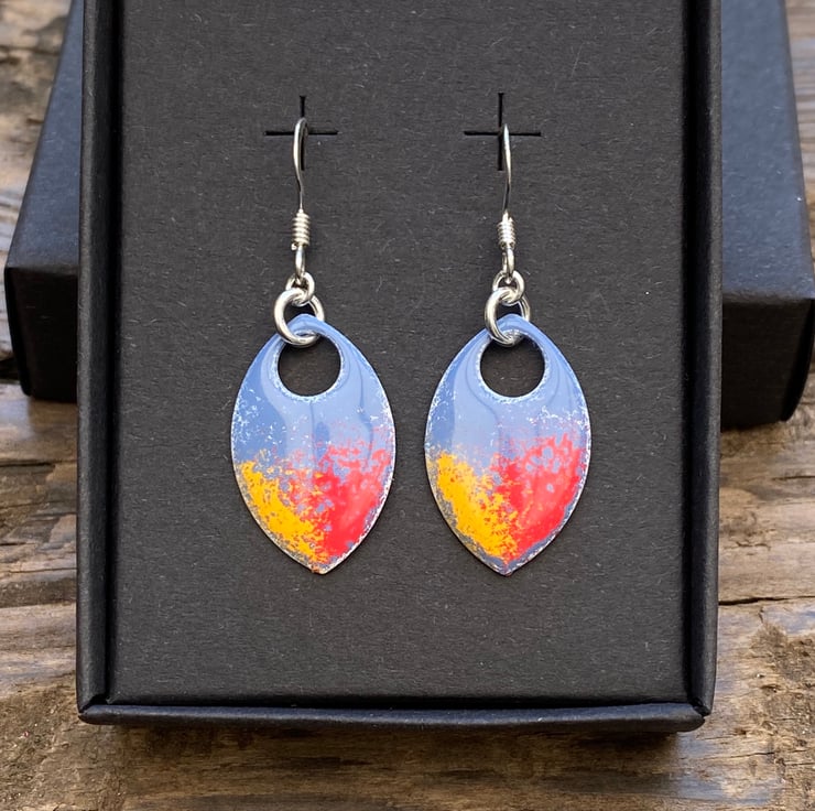 Super light weight aluminium scales have been hand enamelled in a number of layers of cold enamel. These hang from sterling silver fish hook earrings using sterling silver jump rings. The back of the scale remains blank, silver in colour.