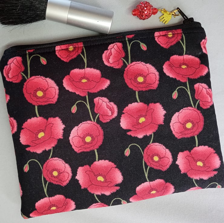 This gorgeous Poppy fabric makes a stylish 15x19cm flat make up bag which is wadded and lined in black cotton.