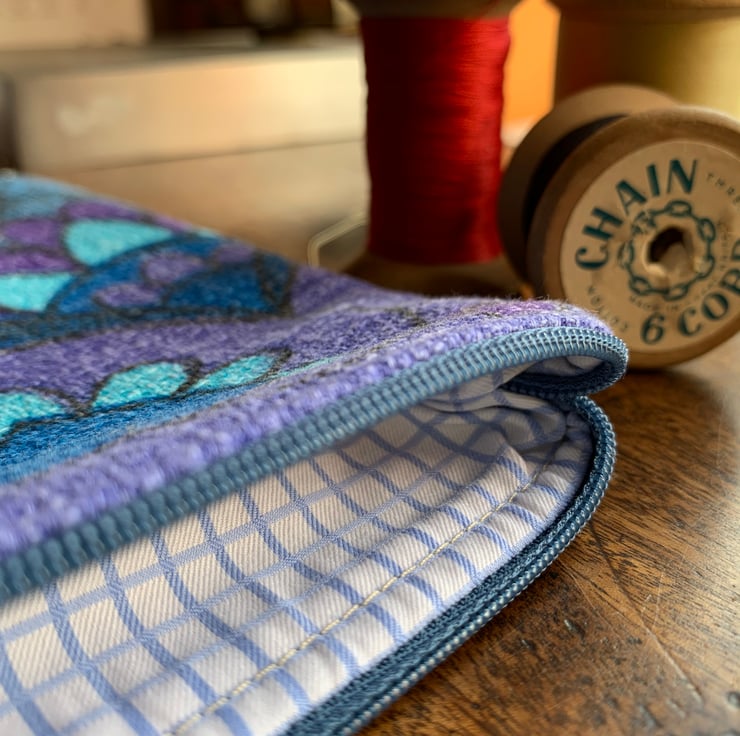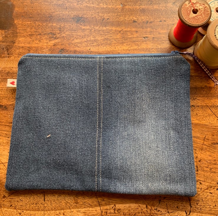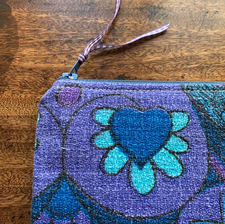 Bright zip pouch in reclaimed barkcloth and denim. This fabulous retro fabric came from a seventies curtain and the denim from recycled jeans. The pouch is fully lined with cotton reclaimed from a shirt.