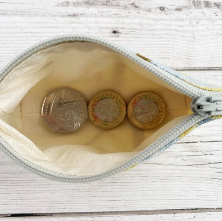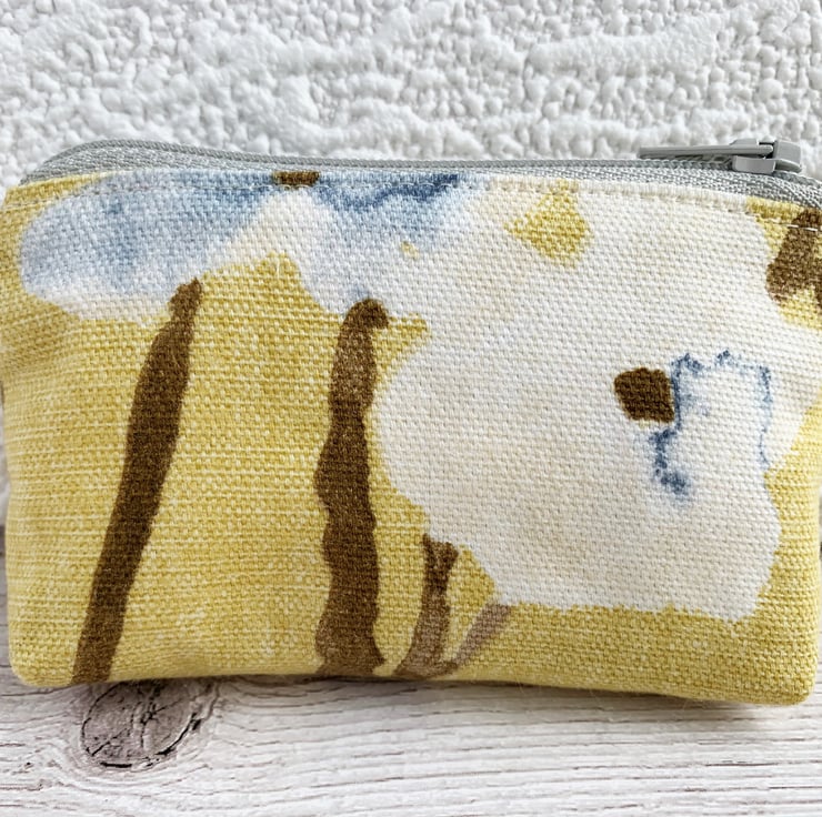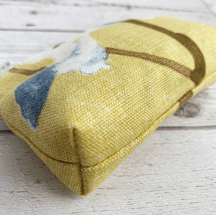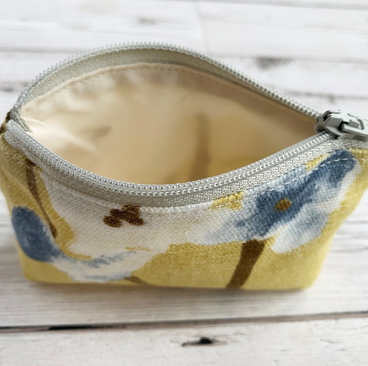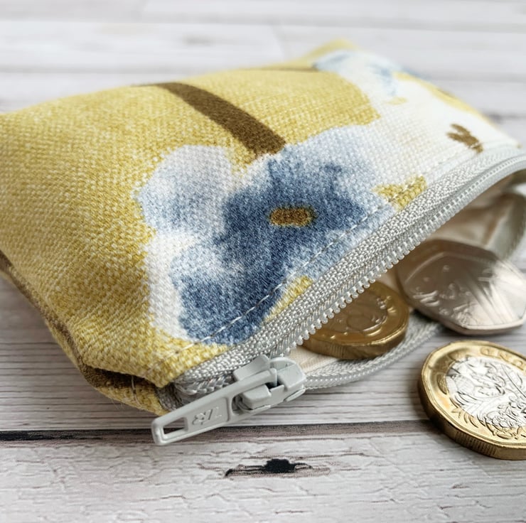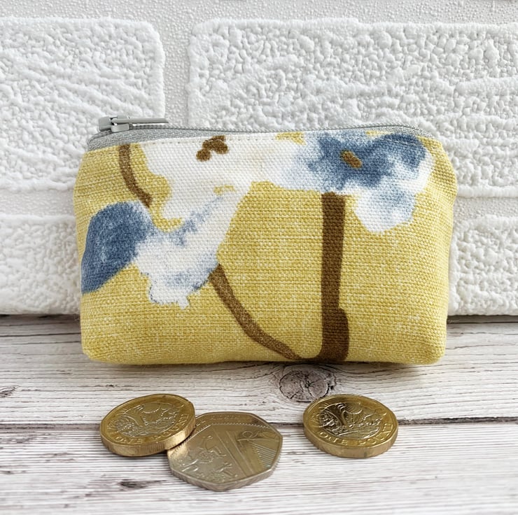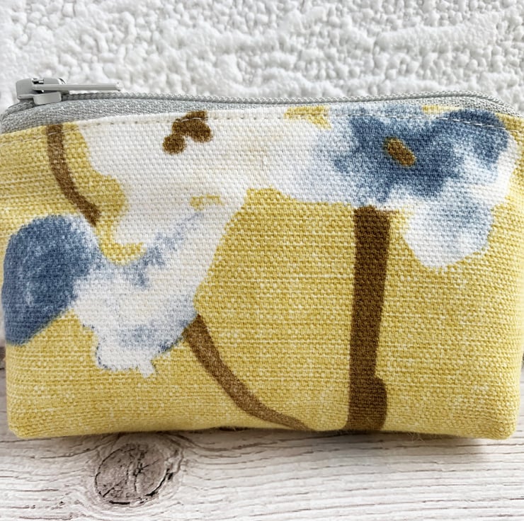 A small purse made from a pretty floral print fabric. The fabric is a gorgeous mustard yellow colour with a pattern featuring blue and white flowers on brown stems. The coin purse fastens with a pale grey zip and is lined with cream fabric. The base of the purse is boxed to give extra space inside.