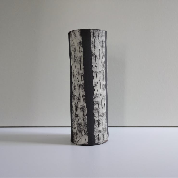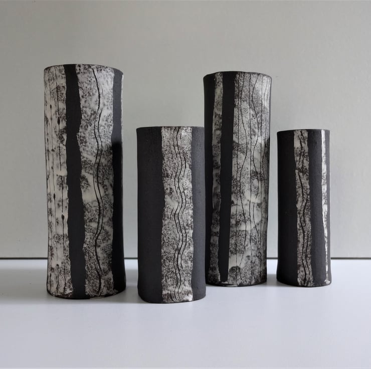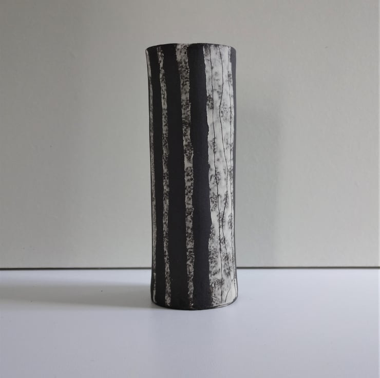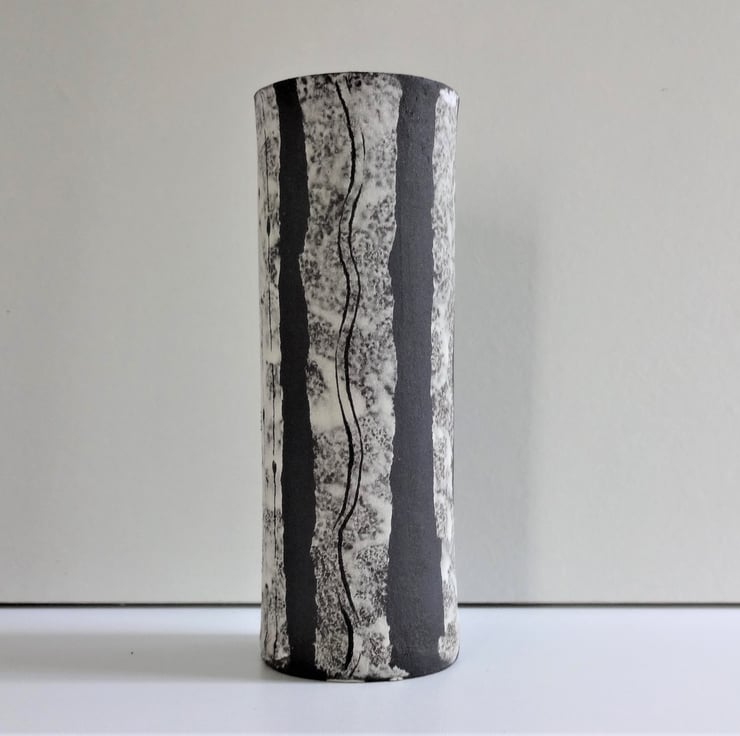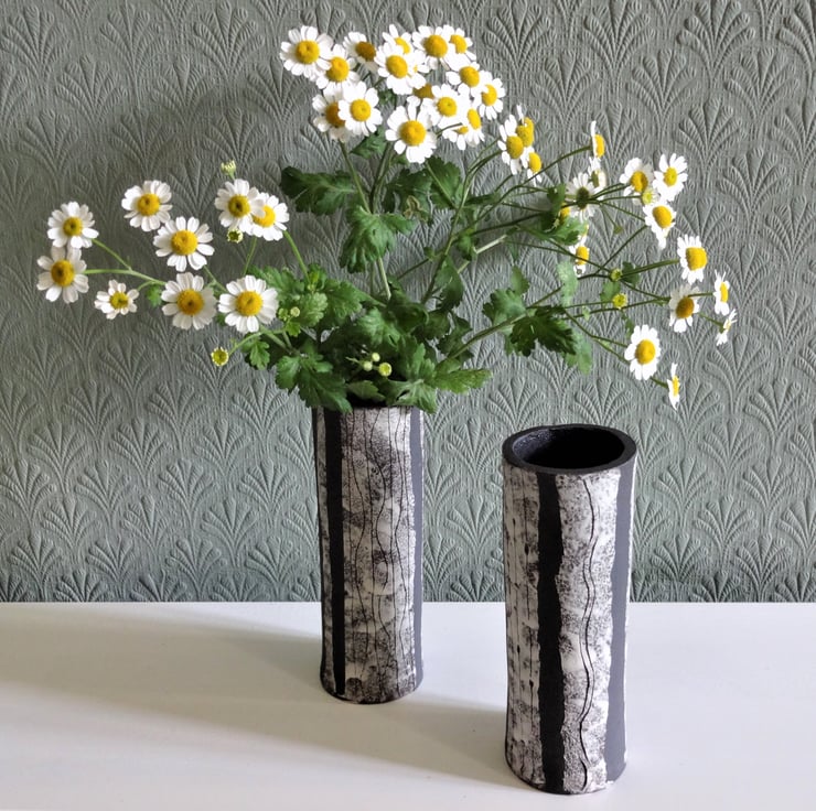 With white on black decoration, this small flower vase fits in with any room scheme, urban or country style. Genevieve is 14cms tall, with a glazed interior to hold fresh flowers. On the outside I have created panels and abstract stripes, with incised sgraffito decoration revealing the black clay beneath. You can see the different panels and patterning in the images, and how flowers can set off the designs. My motifs are lines, curves and emerging seedling shapes, while on the base you’ll find my maker’s mark of a swallow in flight. Genevieve looks at home as part of a group of Mono pieces as you can see in one of the images, or can stand alone as a focal point.