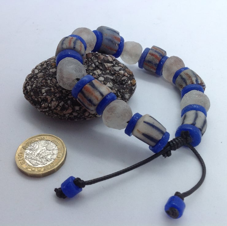 Man's adjustable bead bracelet with new and old African beads, blue and opaque
