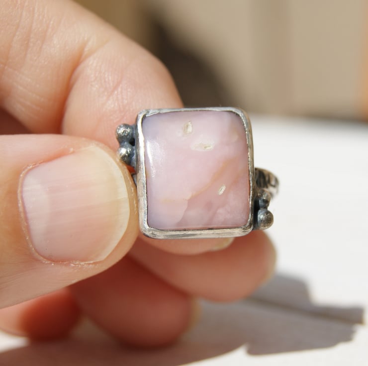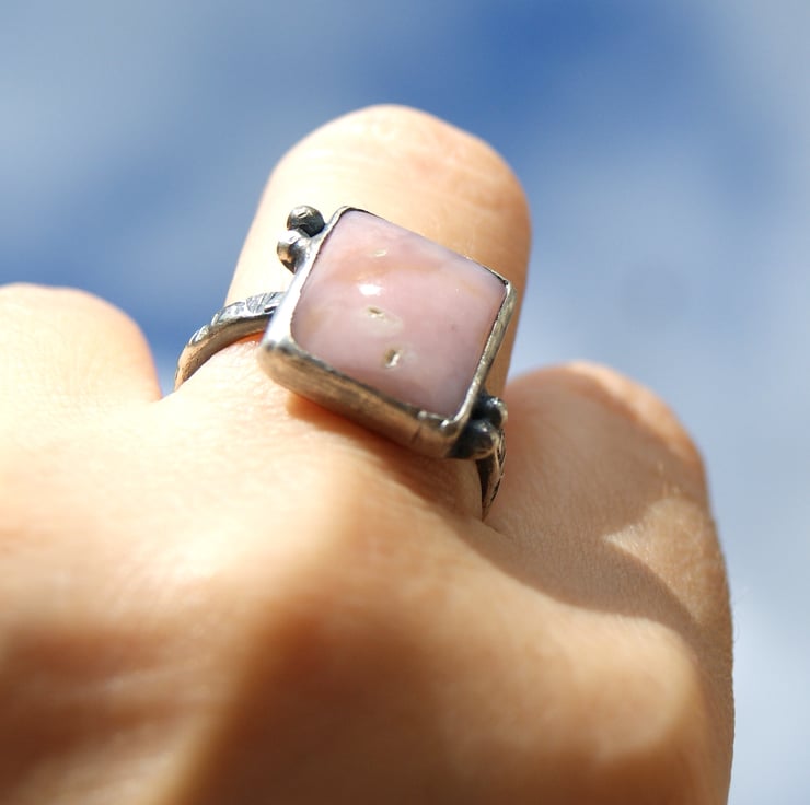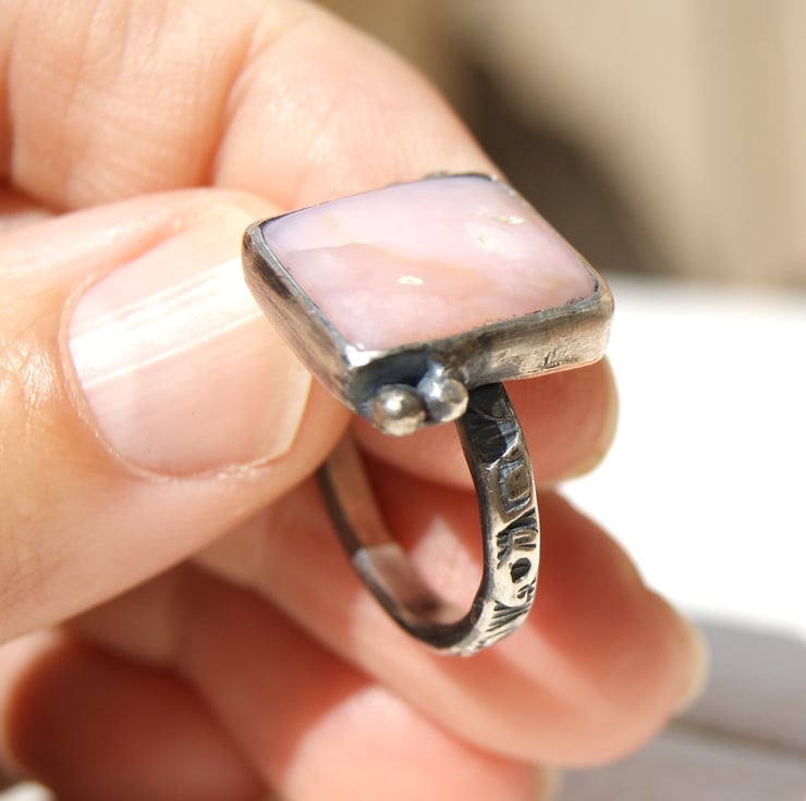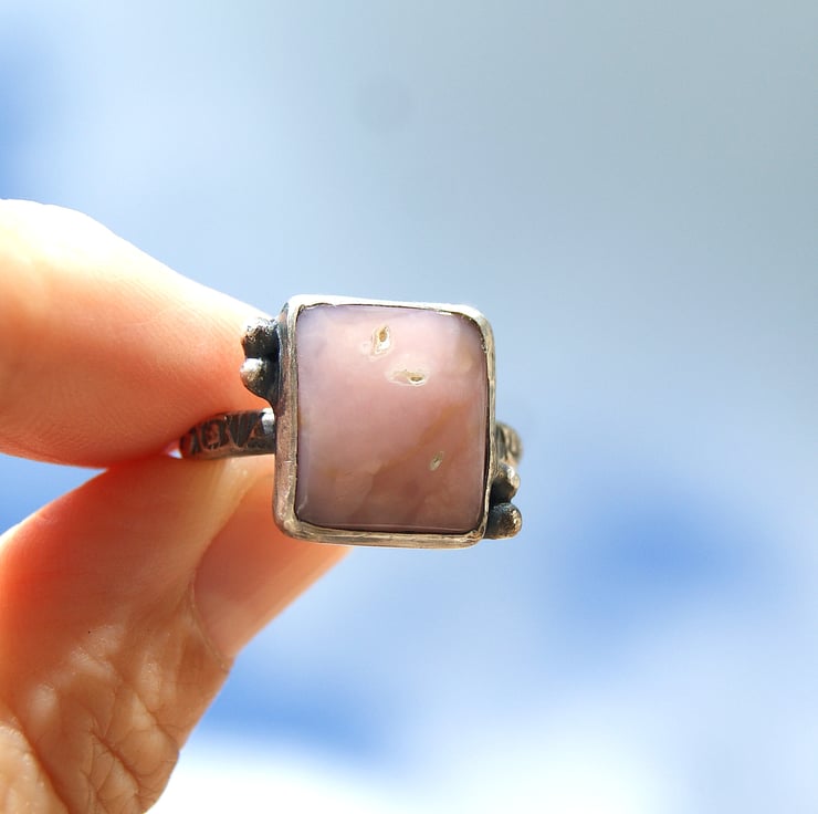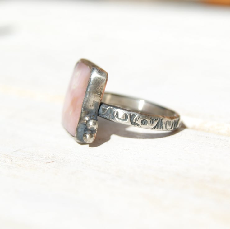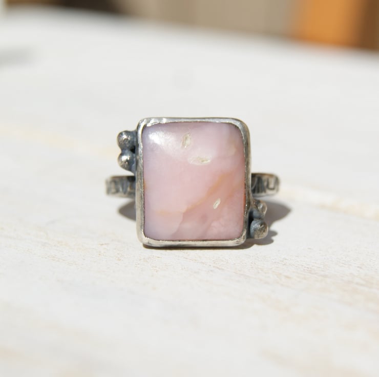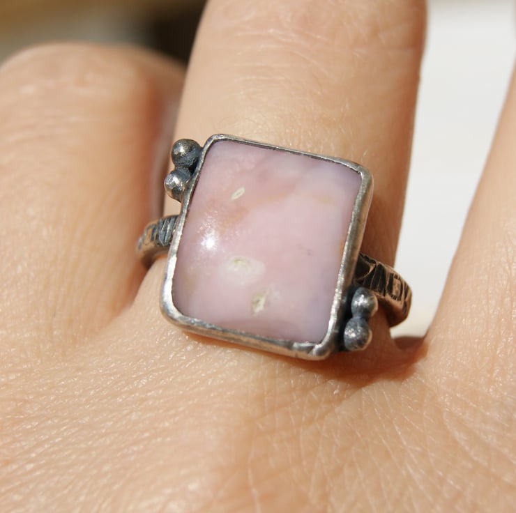 Stunning distressed sterling silver ring with a Peruvian Pink Opal stone that is totally handmade. The band has been hand forged from solid sterling silver and textured.