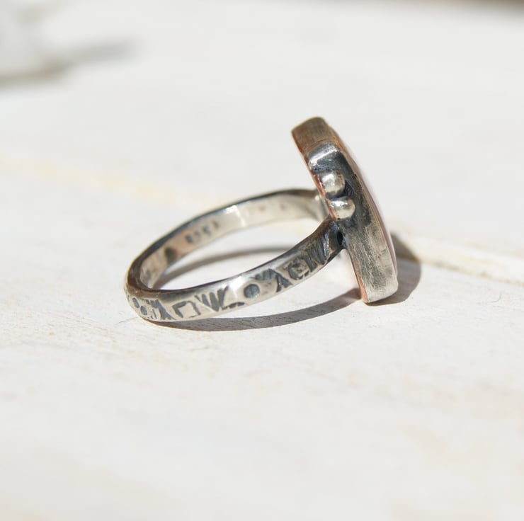 The stone is set in a handcrafted distressed look silver bezel on the pure copper bottom, with hand-formed silver balls. The ring has had a patina to bring out the wonderful textures and also gives it a vintage look.