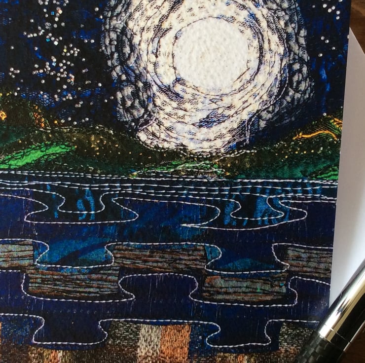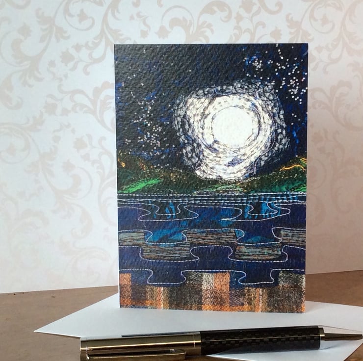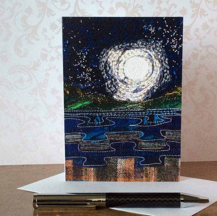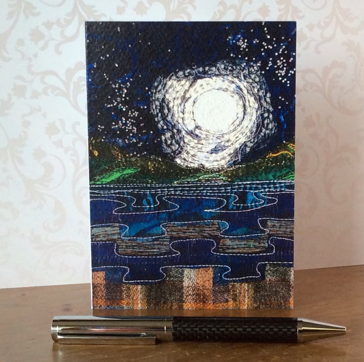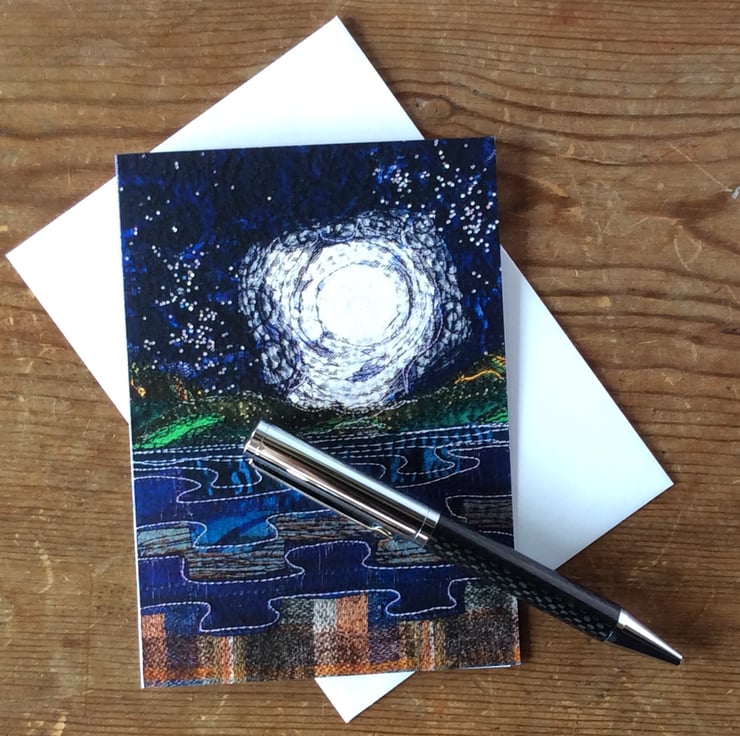 This atmospheric textured card shows a full moon set over the sea, with hills in the background. Moonlight reflects on the water and stars twinkle in the sky. The card is blank inside making it ideal for any occasion and it comes with an envelop in a plastic packet to keep the card clean. The card is A6, which is 10.3 x 14.7cm.