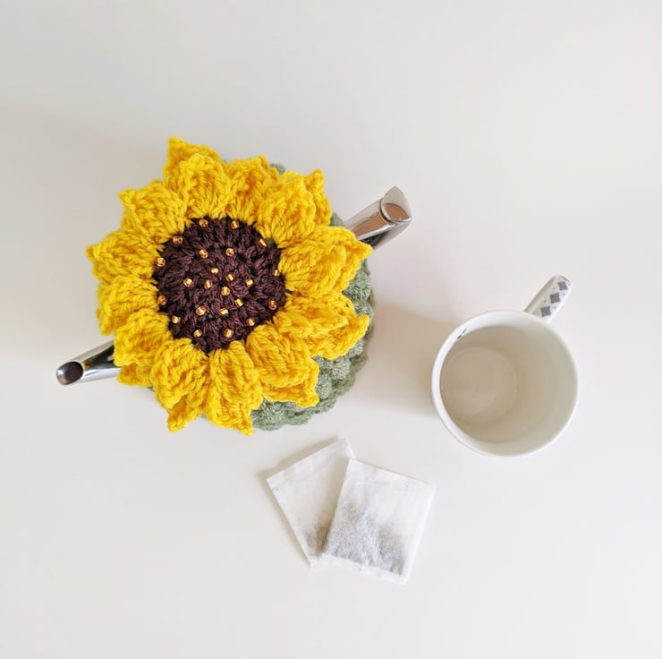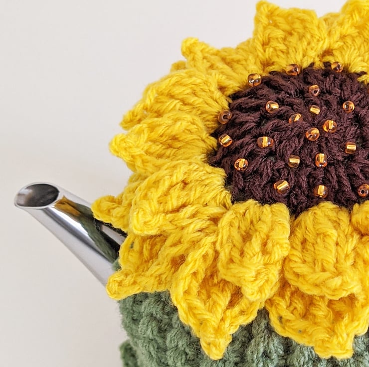 The main part of the cosy is crocheted from two strands of mid-green yarn together, making it lovely and thick to keep your tea warm for longer and it's topped with a yellow and brown sunflower decorated with little amber seed beads.