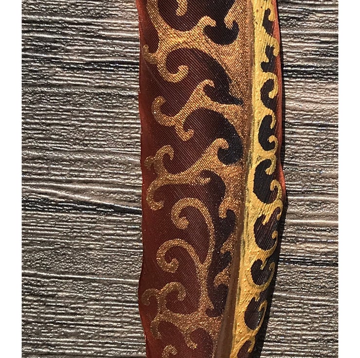 A pigeon feather painted copper on the reverse with gold curling decorations on the front. The copper behind glows through the feather faintly to make a background for the curling golds of the design on the face of the feather.