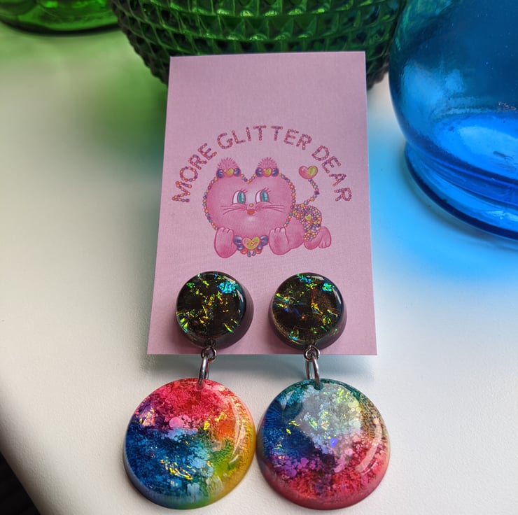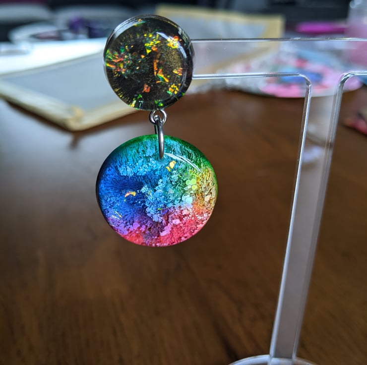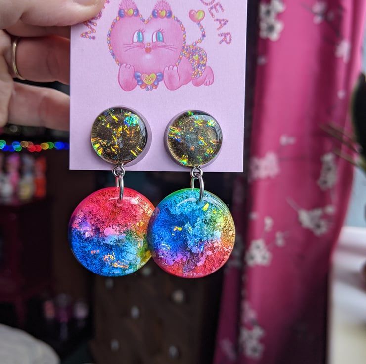 Super bright and funky, these hand cast resin earrings are made with iridescent effect material and paint, to give a jewel look to the circle part of the earring