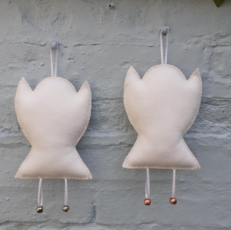 The reverse of the angel is a plain white wool felt. Front and reverse pieces have been hand-stitched together in a cream thread and lightly padded with synthetic toy stuffing.
