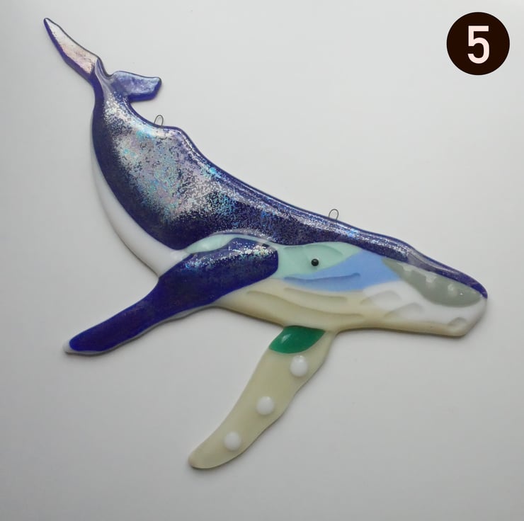 These wall hanging fused glass Humpback Whales are ideal for decorating indoor or outdoor spaces. Every whale uses a slightly different mix of glass colours, shapes and markings to ensure each is unique, and come with either a green or blue luminescent back with shimmers with a metallic sheen in certain lights.
