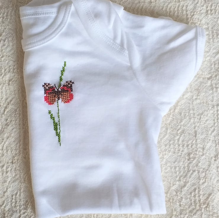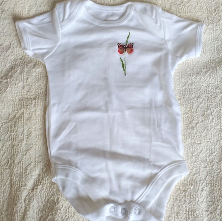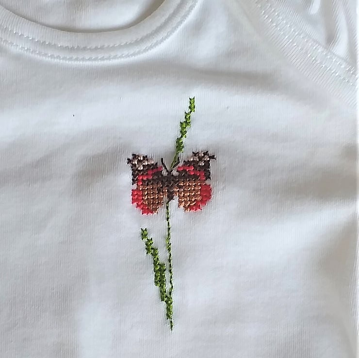 I have hand embroidered a gorgeous red and brown butterfly on this lovely soft cotton vest/onesie by Tu. The butterfly is loosely based on a red admiral, or 'Frenchie', as they call them in this neck of the woods. As I never use a permanent backing when hand embroidering kids' clothing, there is nothing inside to irritate your child's skin. The vest has an envelope neck, short sleeves and three press-studs between the leg openings. It is 100% cotton and machine washable.