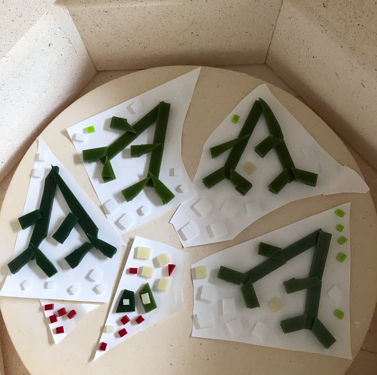 This glass decoration has been made with handcut Bullseye glass and fused at 800 degrees Celsius before cooling and fired again to 750 degrees Celsius to tac fuse the berries.