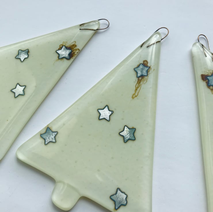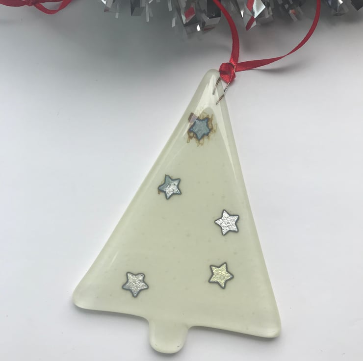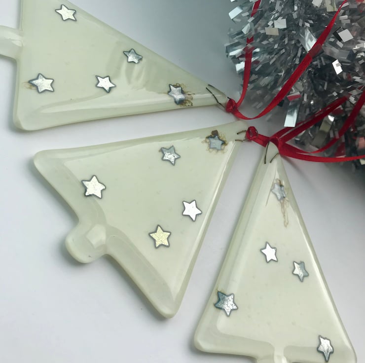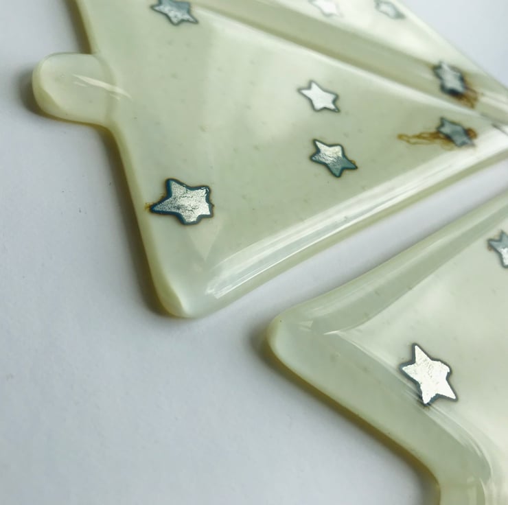 It is made from two layers of hand cut glass, vanilla on the bottom and clear on the top. I place sterling silver foil stars in between the two layers. It is then placed in the kiln and fully fused.