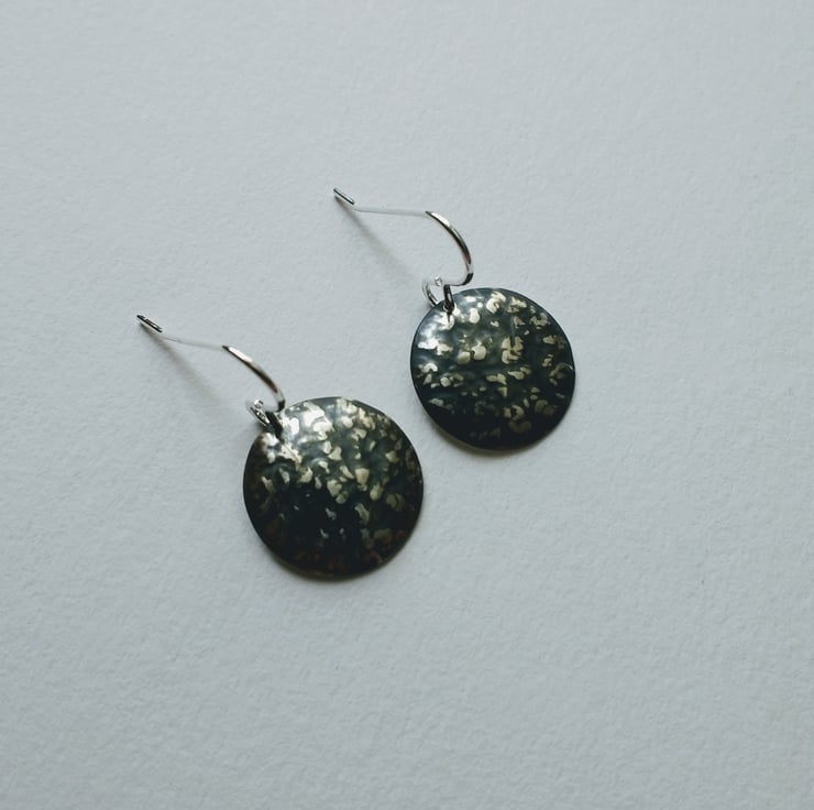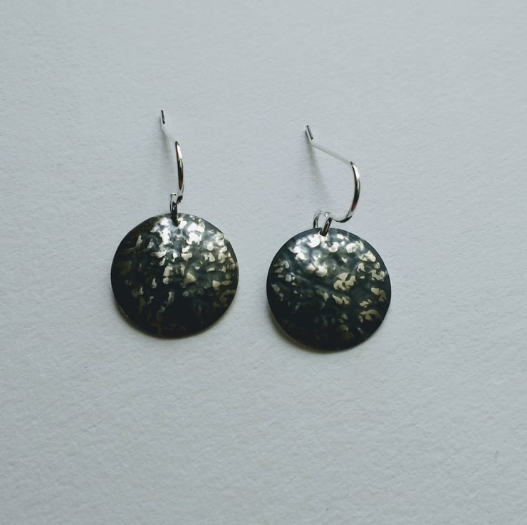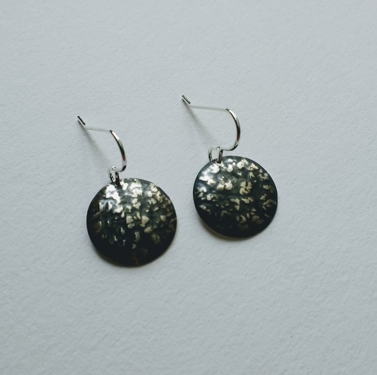 Handmade in my Yorkshire studio, these Sterling Silver Earrings which are part Oxidised to create the two tone black and silver colour contrast are part of my Blackwave Range. They are a circular shape which has been gently domed and textured using the technique of Repousse. They have a small drilled hole at the top which the Sterling Silver Earwires are attached. The technique I use is produced by hand so each pair is unique.