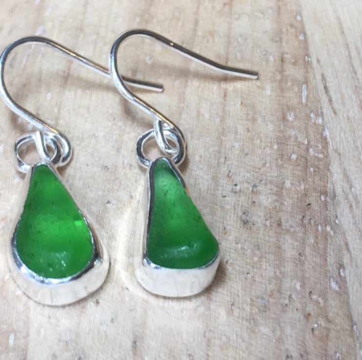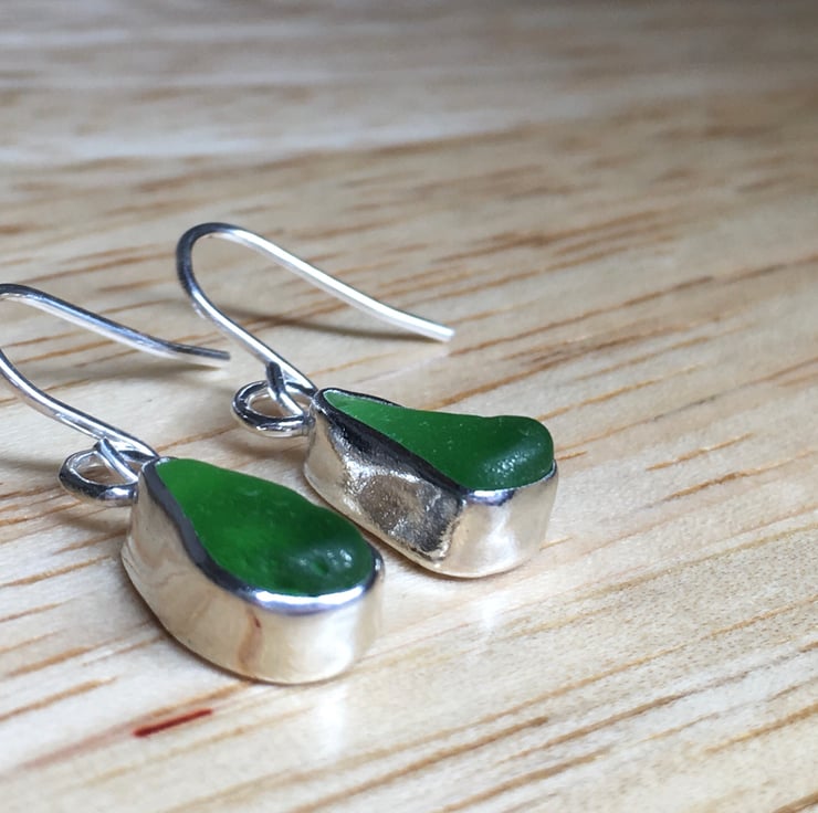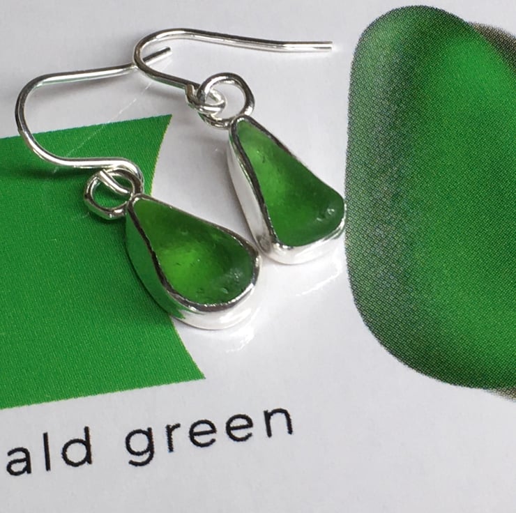 Strikingly beautiful emerald green sea glass and silver small dangle earrings, shine different shades of emerald green in different lights! Stunning