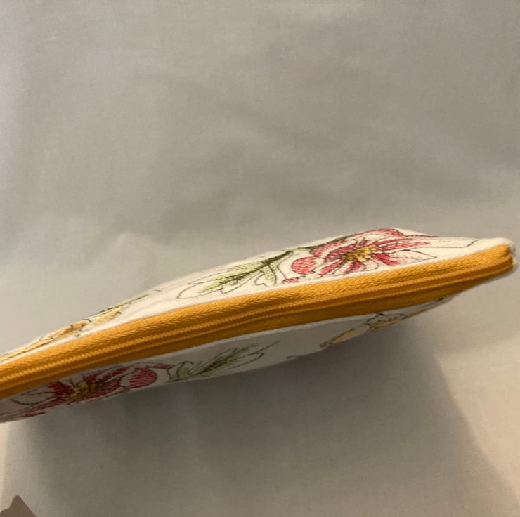 Embroidered floral design on front and back of this zipped, lined makeup bag. Very attractive floral design on a 100% cotton background fabric. Lined with pale green floral fabric. Mustard coloured zip closure. Size 8ins wide, 6ins deep. Lovely gift, can be filled with toiletries, or makeup, perfect for Mother’s Day