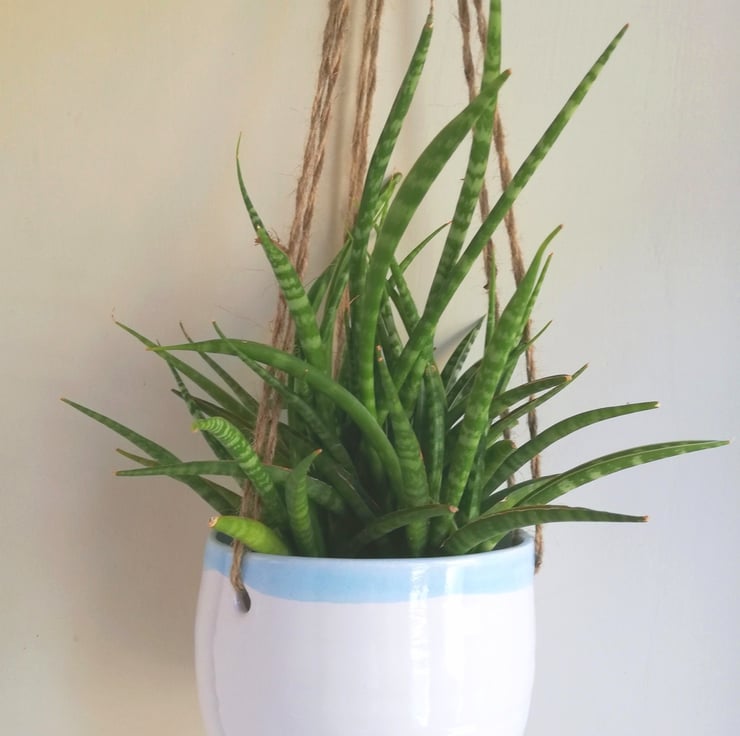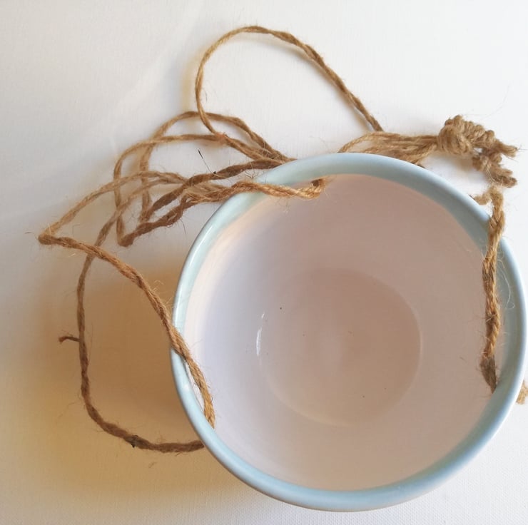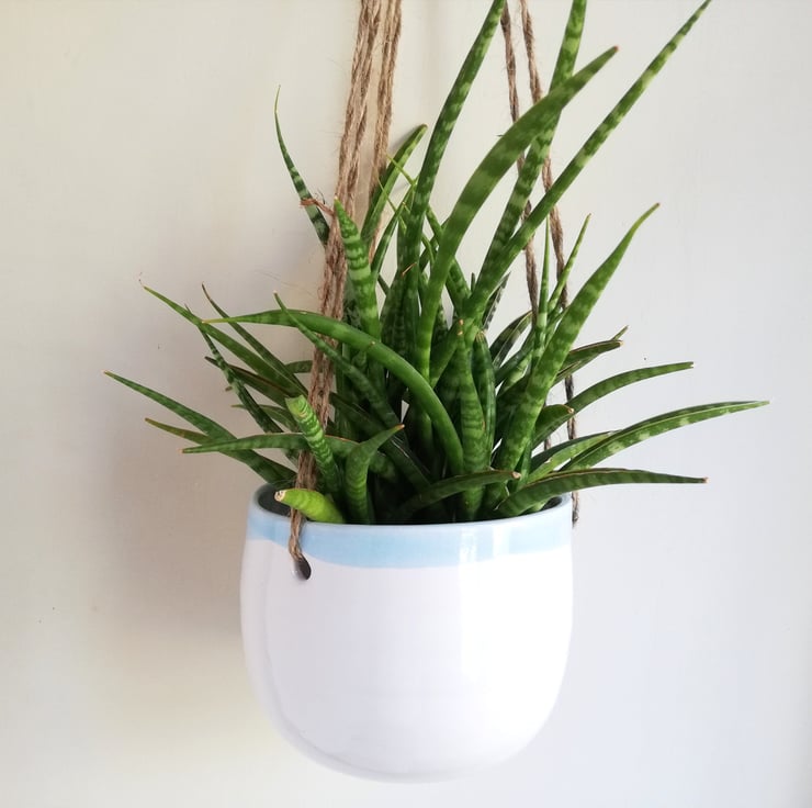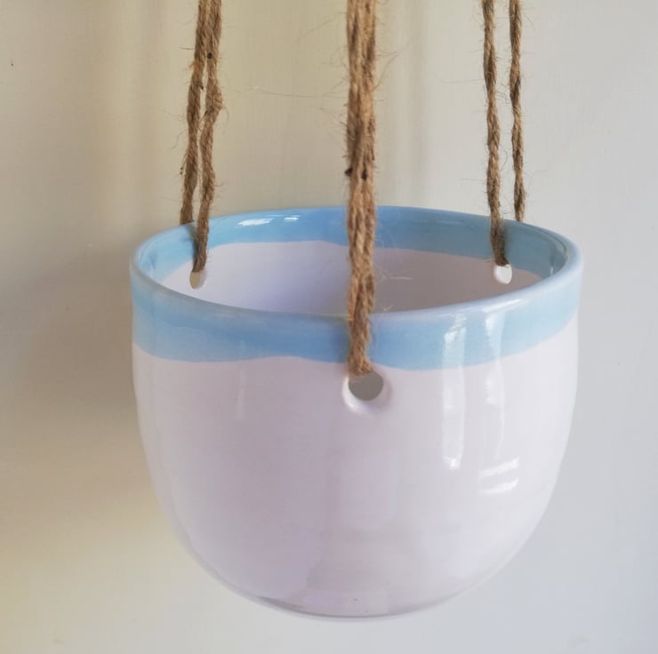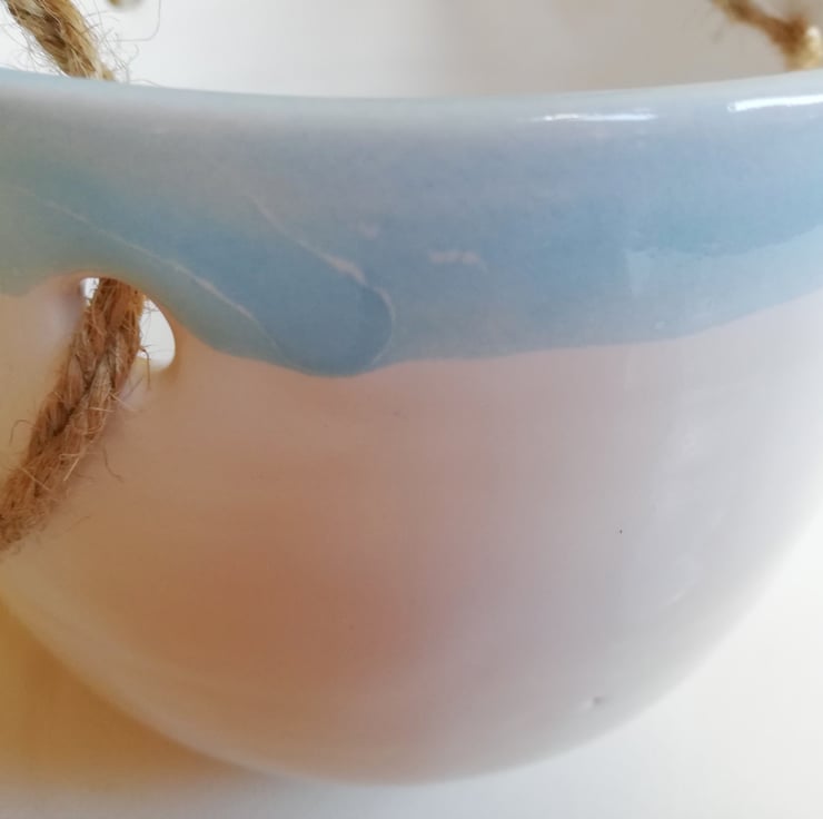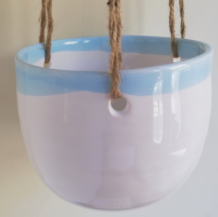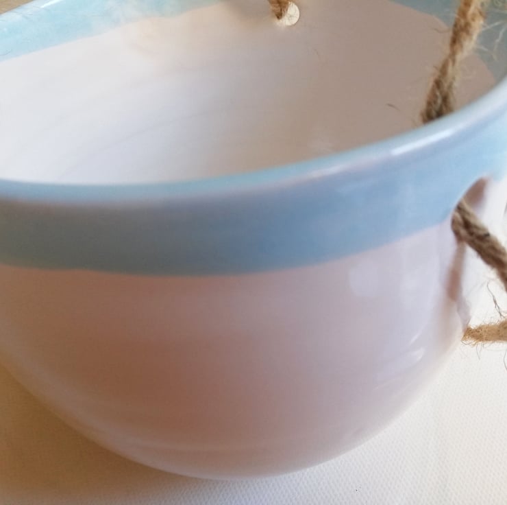Hand thrown pottery suspended plant pot with shiny white glaze and pale turquoise blue glazed rim.