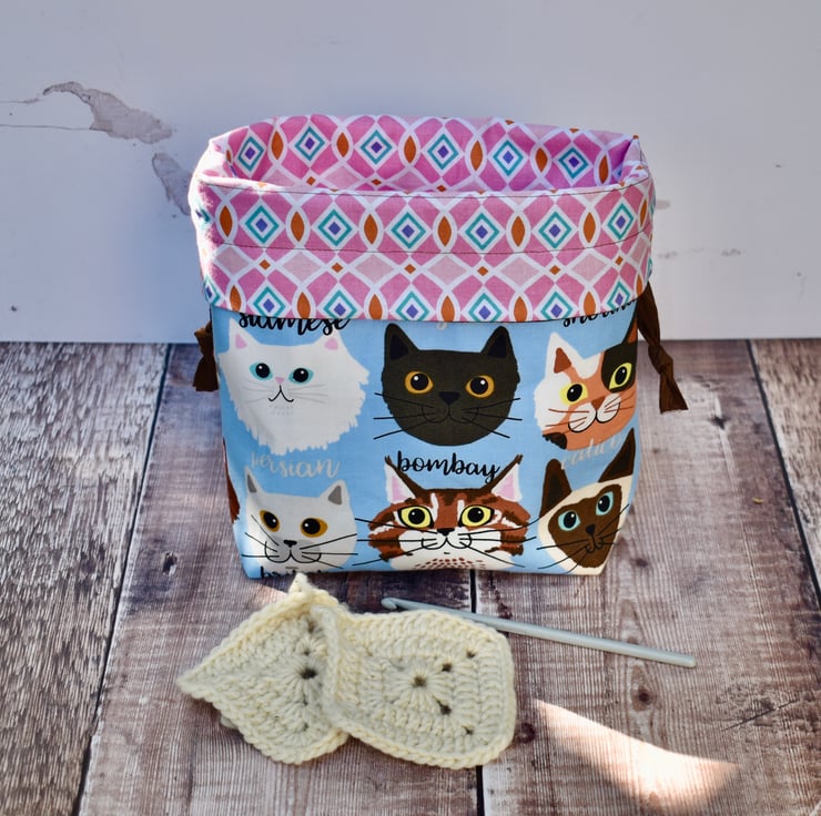 These drawstring bags are a fun and practical way to keep small knitting and crochet projects clean and well-organised.