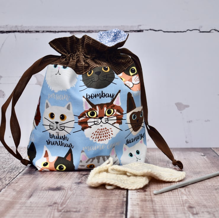 These drawstring bags are a fun and practical way to keep small knitting and crochet projects clean and well-organised.