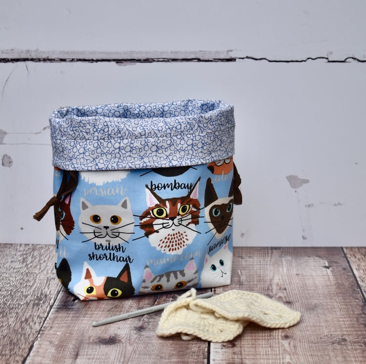 The bag is fully lined and the lower section of the bag is interfaced to provide more body to the fabric and allow it to be used as a bucket when crafting (see second photo). Co-ordinating fabrics are used for the contrast trim and lining. Ribbon ties make it easy to access the bag contents and kept them secure when the bag is closed.