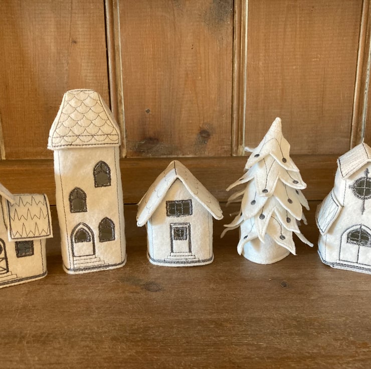 Embroidered felt battery tea light village. 4 White houses, plus one White Christmas tree. Not for use with real flame tea lights. The tea lights supplied are new, and the batterIes can be replaced.