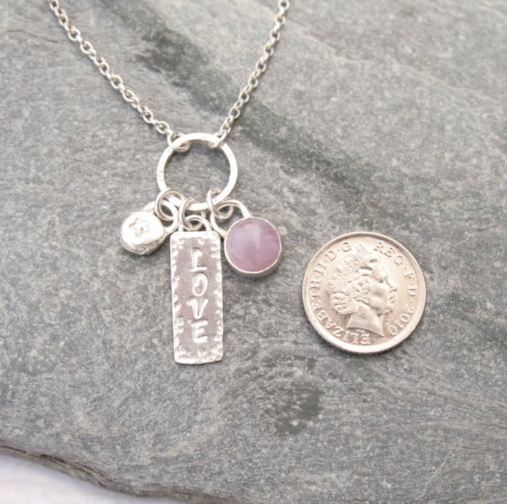 The length of the charm from the top of the hoop to the bottom of the 'love' charm is 35 mm. This hangs from an 18 inch silver chain. The diameter of the hoop is 12mm and the amethyst has a diameter of 8 mm.