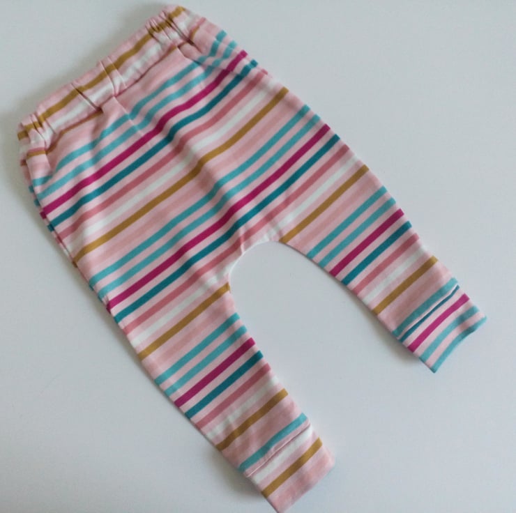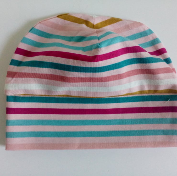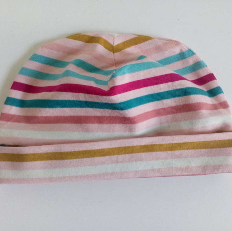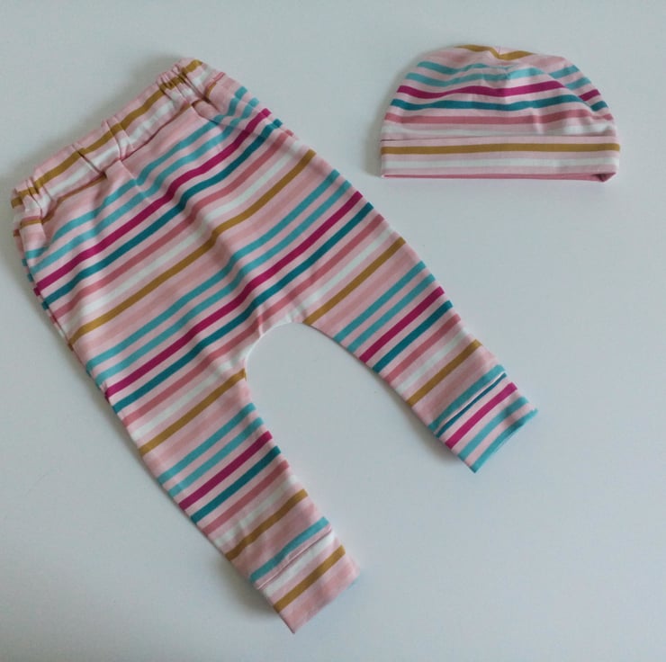 A new baby gift set of slouchy leggings and round style jersey knit hat in a pink stripe design.