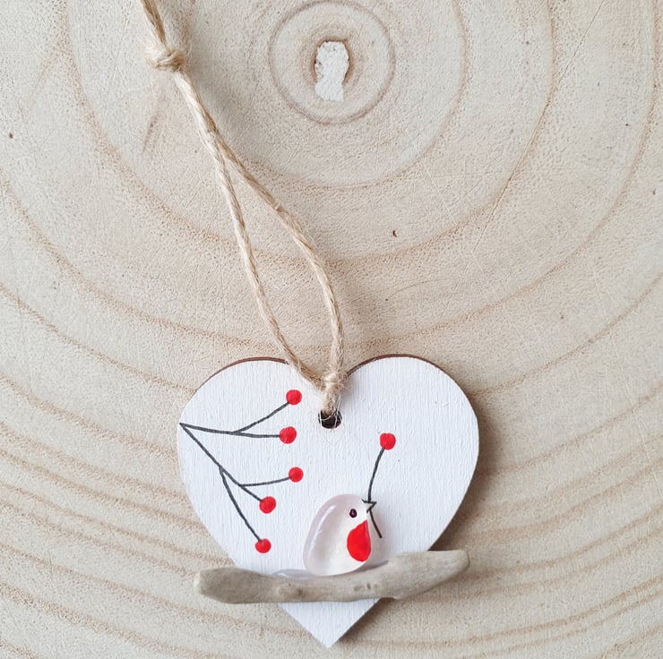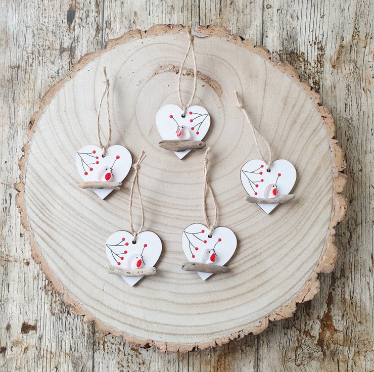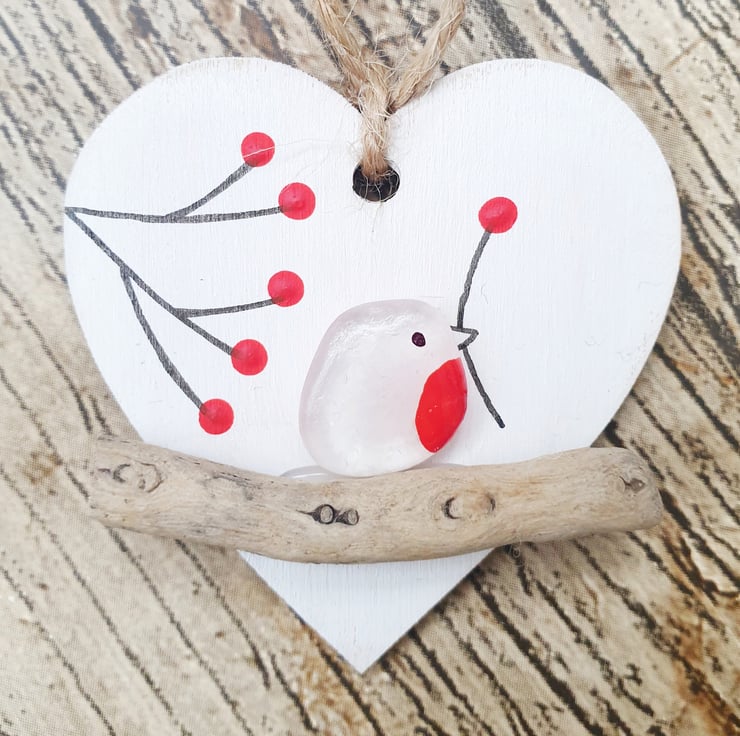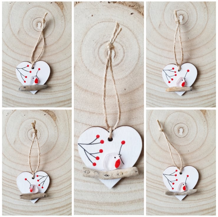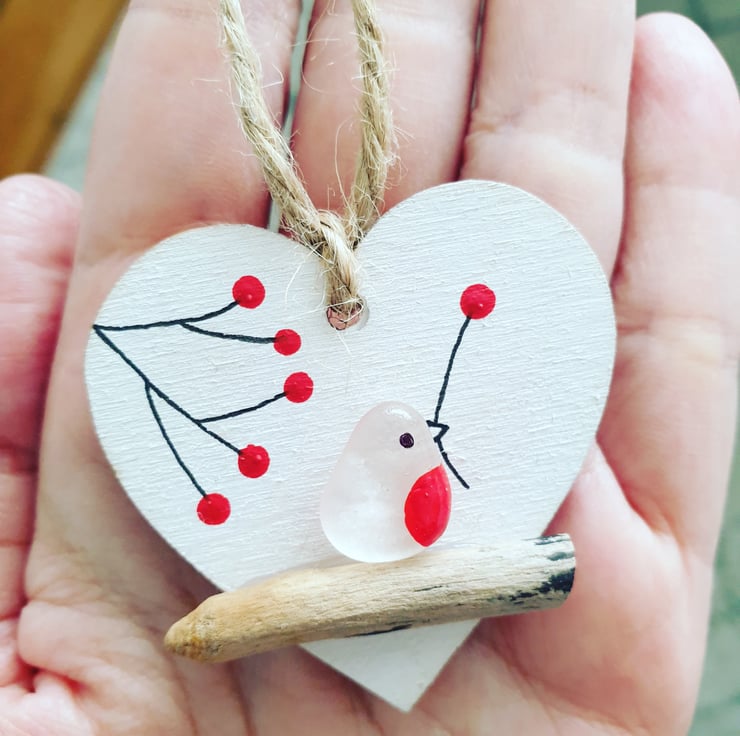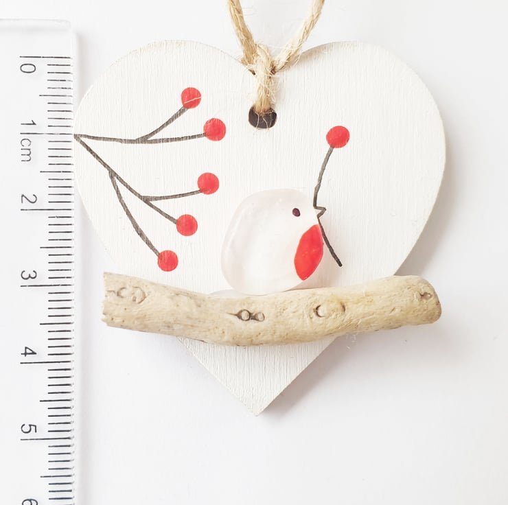 The wooden heart measures appropriately 5cm in height without the jute string. Please note that you'll be given a random robin upon purchase. While every seaglass and driftwood may differ in shape and texture, they are more or less about the same size.