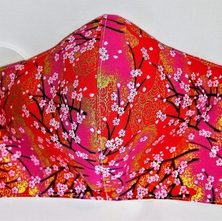 Hand made 100% cotton triple layer face mask. Reusable and washable with a nose wire that can be removed prior to washing. This is made with 3 layers of cotton. The outside layer is a is in a beautiful Japanese style printed cotton in red, with pink cherry blossoms, highlighted with gold. The other 2 layers are both a plain cream cotton.