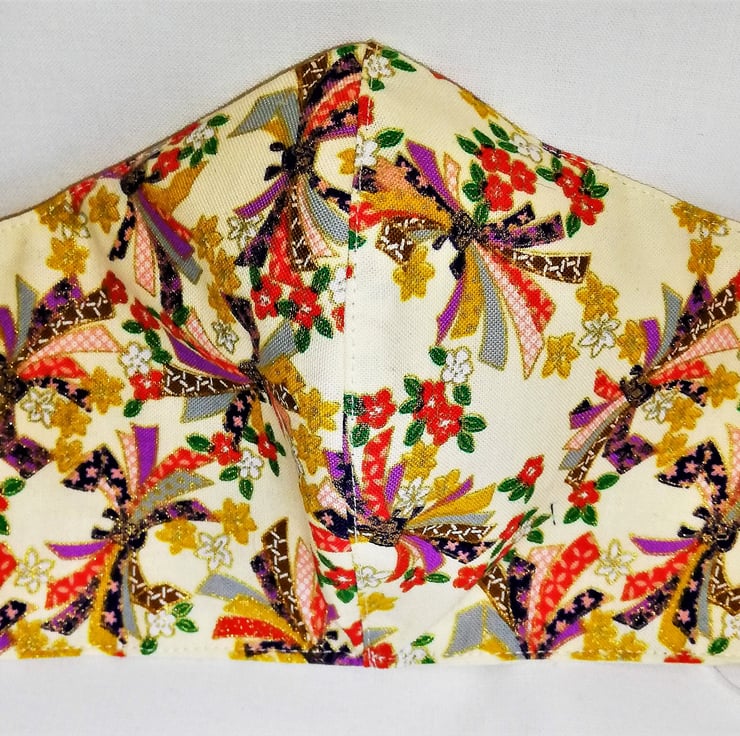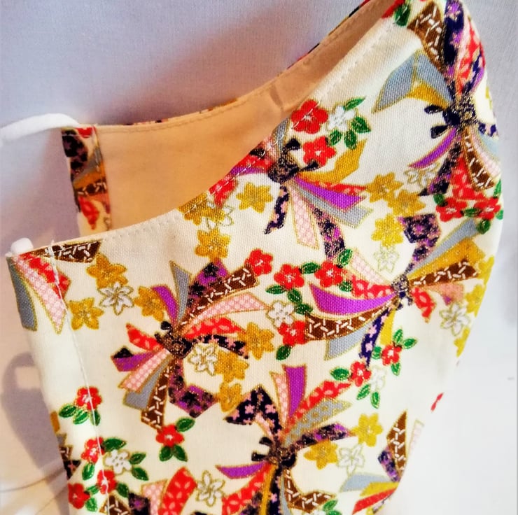 Hand made 100% cotton triple layer face mask. Reusable and washable with a nose wire that can be removed prior to washing. This is made with 3 layers of cotton. The outside layer is a is in a beautiful Japanese style printed cotton in cream, printed with multicoloured ribbons and flowers, with gold highlights. The other 2 layers are both a plain cream cotton.