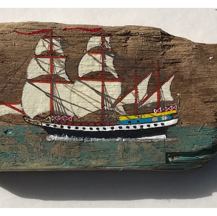 This is the first of a series of ships and boats painted on driftwood I have collected from local beaches.