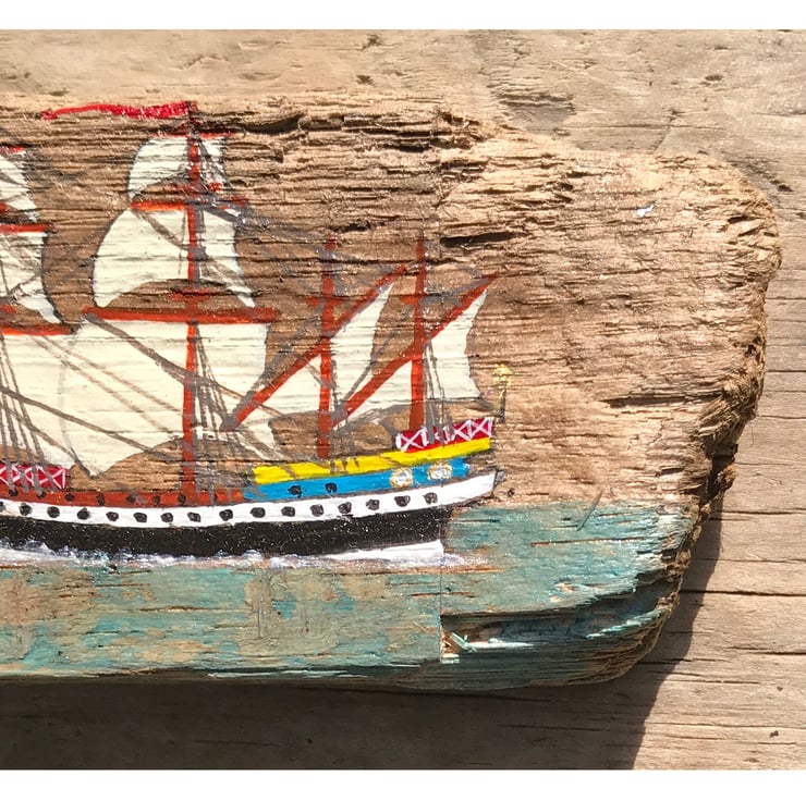A Galleon painted on a piece of driftwood. The wood was found at Mupe Bay while litter-picking.