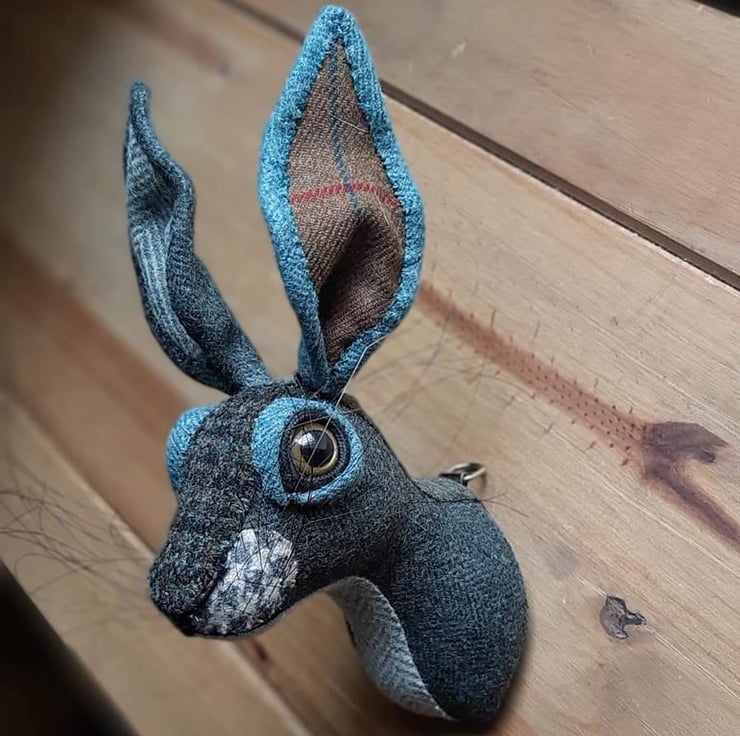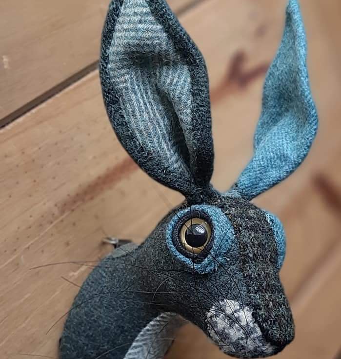 A lifesize textile hare head which I have hand stitched with tweed and tartan Abraham Moon wool fabric.