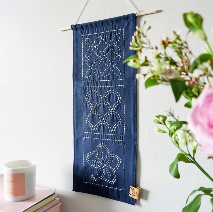 Learn 3 Sashiko stitches, whilst creating a beautiful wall hanging, which is the perfect memory aid for all of your future Sashiko embroidery projects.