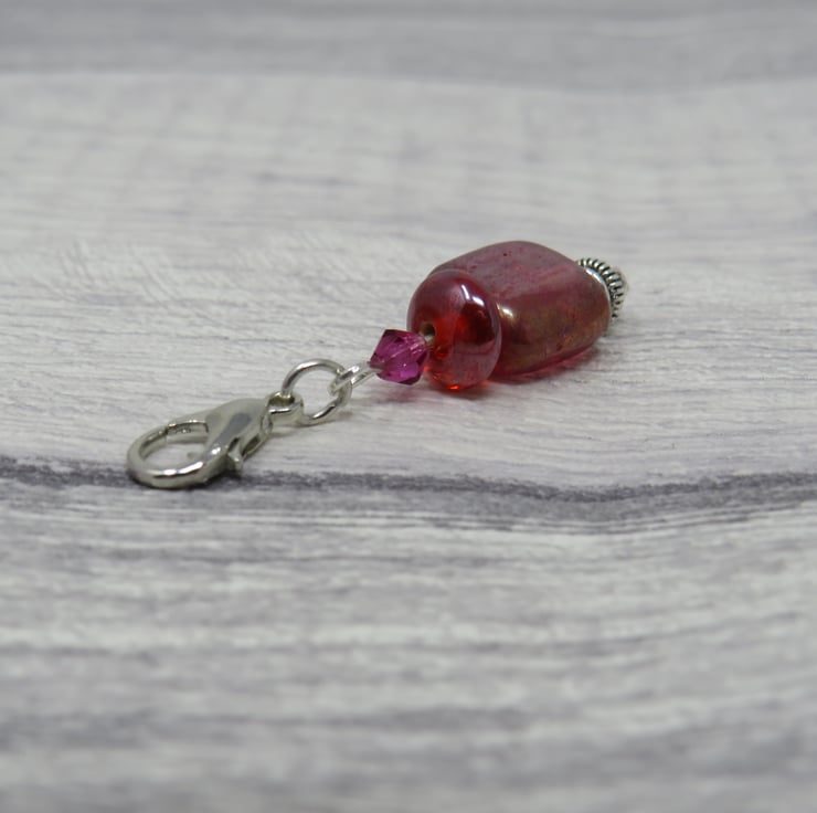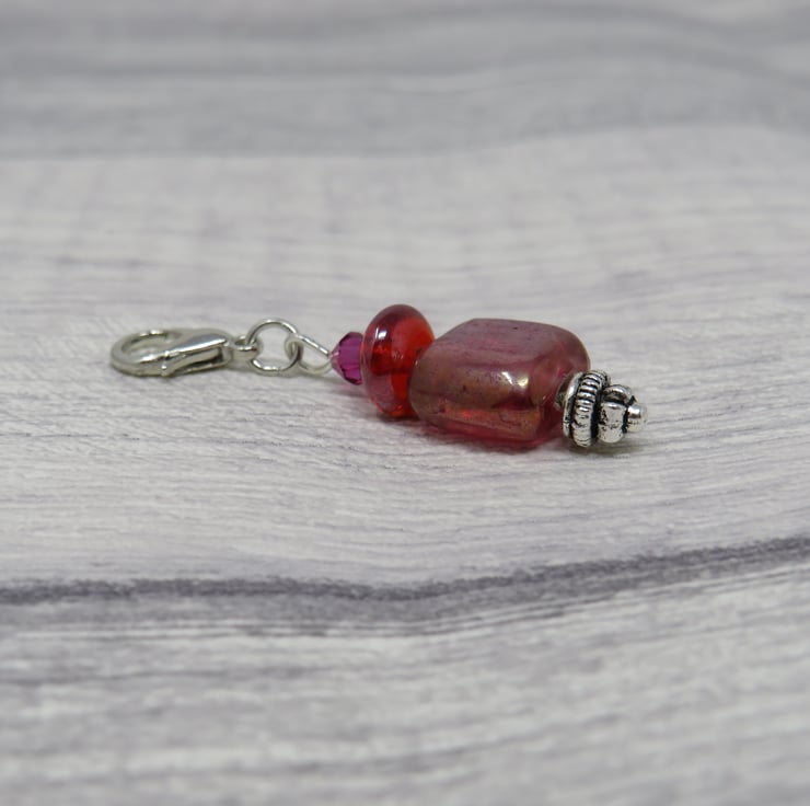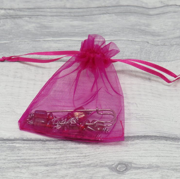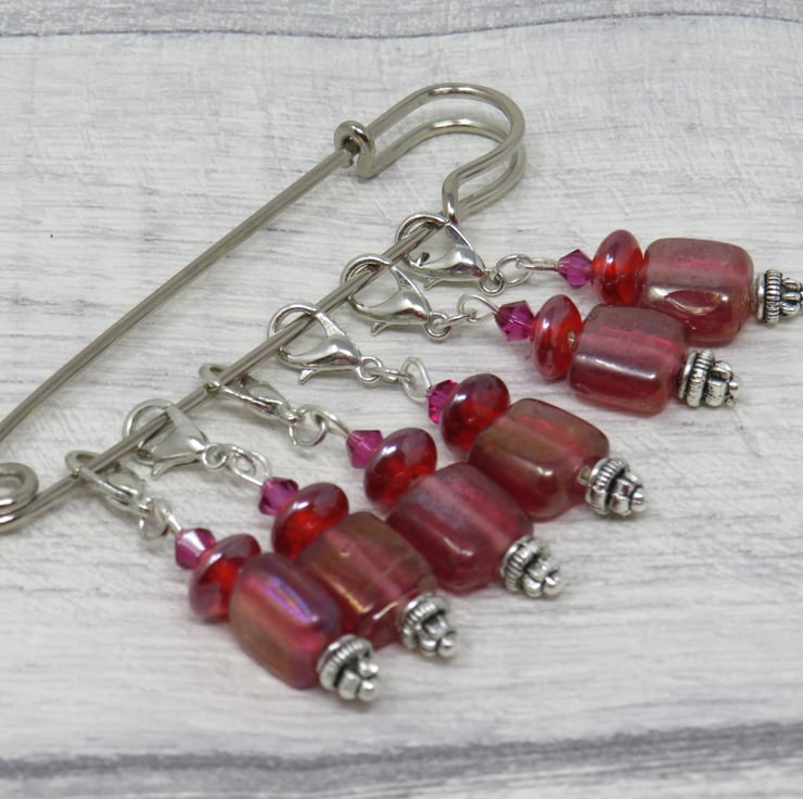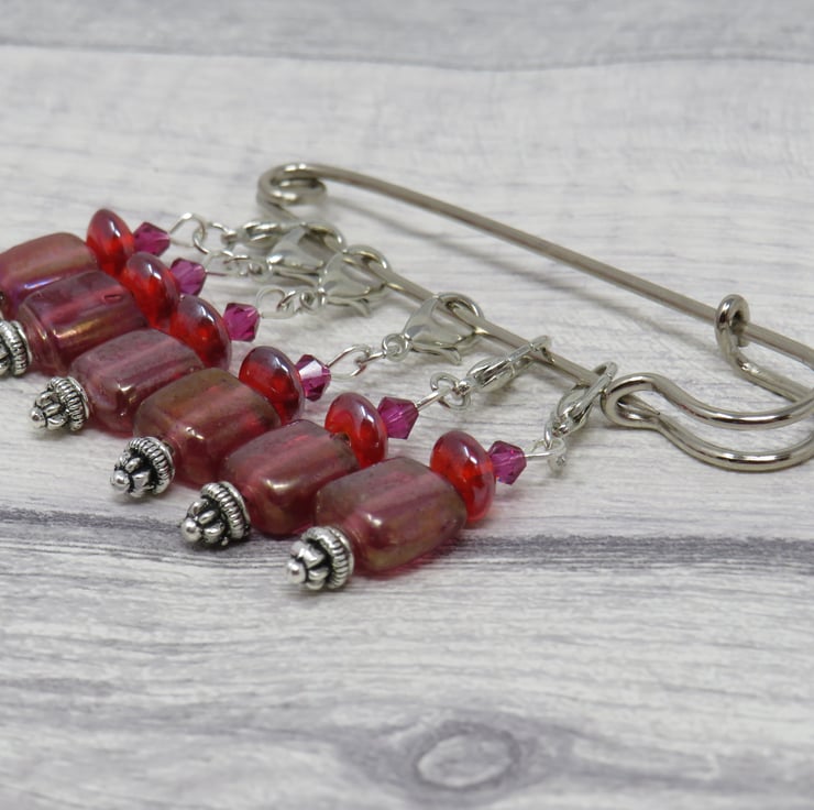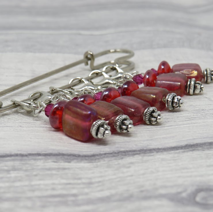 Perfect for those who love to knit or crochet, this set of 6 stitch markers has been handmade using deep pink glass beads. Each marker comprises 3 glass beads threaded on a decorative silver coloured head pin and finished at the top with a small lobster clasp. They measure 4 cm in length and are presented on a silver coloured kilt pin to keep them safe when not in use. They will arrive in a pretty organza bag.