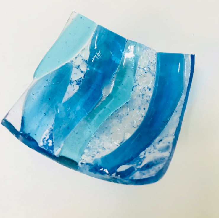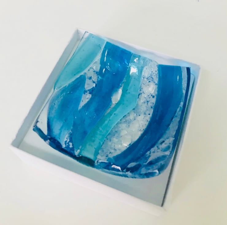 Fused glass shades of blue waves in this 3.5 inch jewelry trinket dish . Comes on a white gift box for easy gifting . Pretty and functional . The the glass is gently contoured aswell as luminous