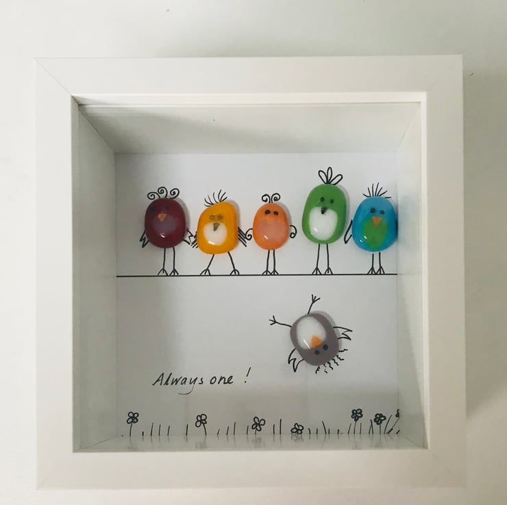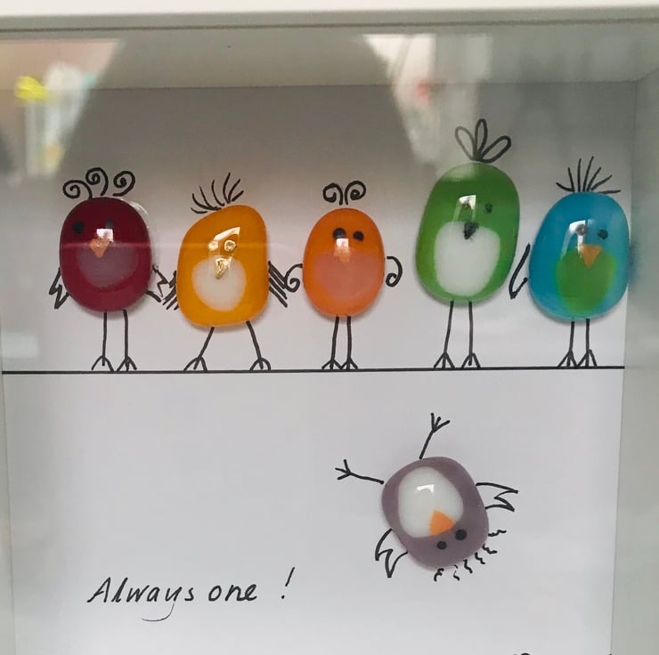 Individually fused birdies in my ‘-always one series ‘ . Cute and quirky can stand as a box frame or hang on the wall . Fun !