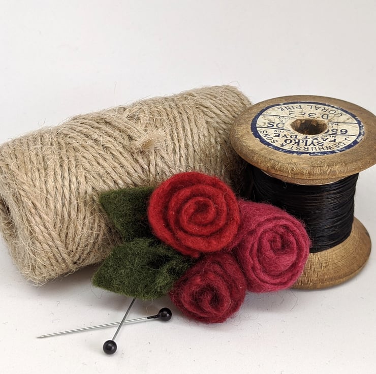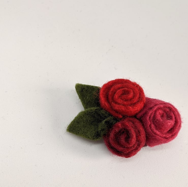 A sweet little cluster of wet felted roses and leaves. The brooch is fastened with a secure brooch pin.