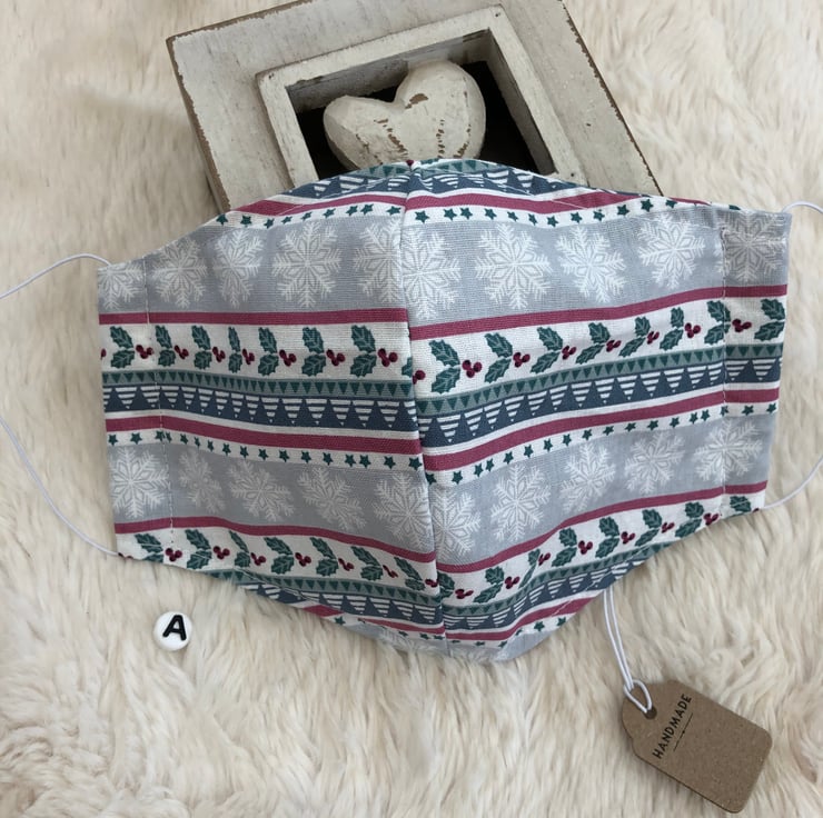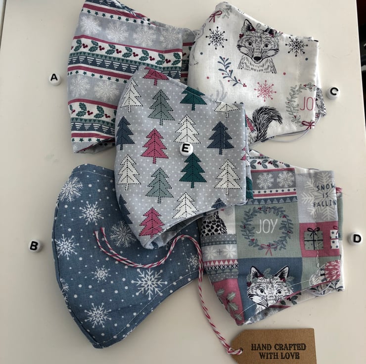 These Christmas handmade face masks are made in a triple layer.2 outer layers of 100%Cotton,inner layer of non woven microfibre fabric,for extra filtration.They are washable,breathable and reusable.They have thin adjustable elastic ear loops.Just untie and hide knot in side seam.They come in a range of 5Christmas Designs.Colour Options A:Grey/Stripe mistletoe.B.SOLD OUT.C:SOLD OUTD:Patchwork Owls.E:Sold Out.Please see my little shop for more colours and pattern designs.