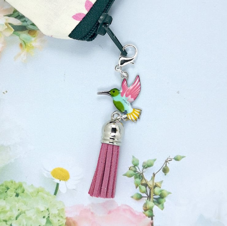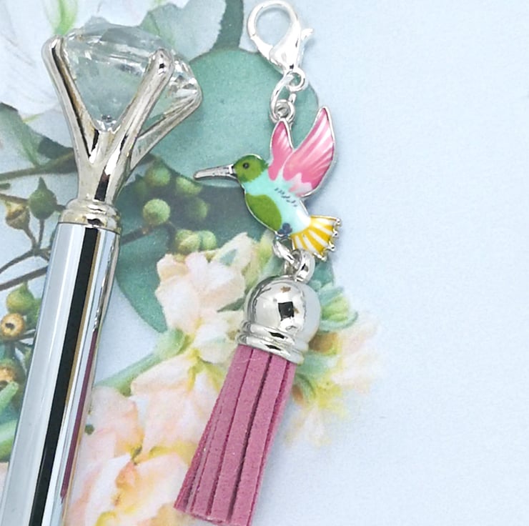 Pretty Enamel Hummingbird Tassel Bag Charm. The faux suede tassel charm is an ideal accessory to your favourite bag. Perfect to brighten up any handbag or key set.