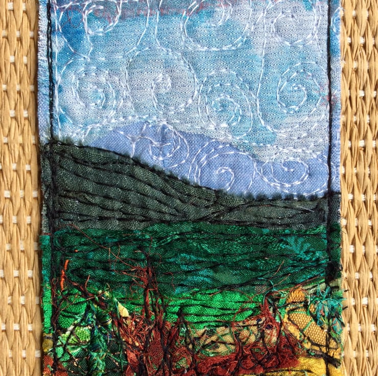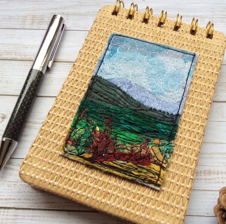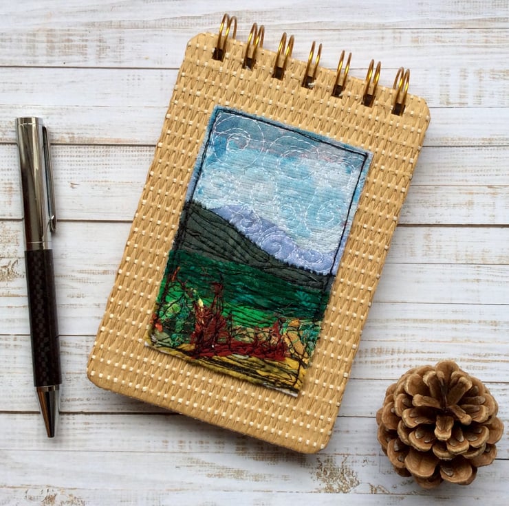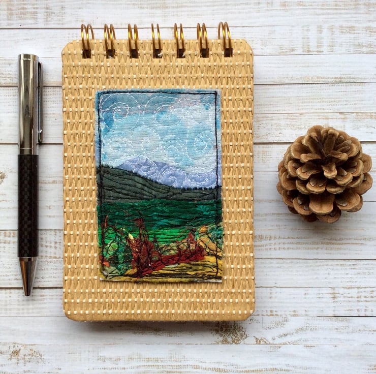 This handy A6 reporters notepad is enhanced with an embroidered landscape. It’s made with up cycled fabrics and free motion embroidery. It has lined paper pages and a brown raffia style cover. It’s ideal for making notes, lists or doodling, and will neatly fit a handbag or pocket. The spiral bound notepad measures 15 x 10cm, contains approx 80 pages.