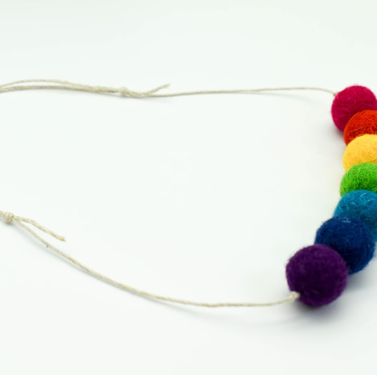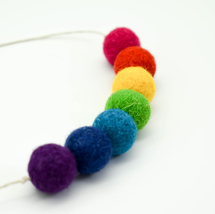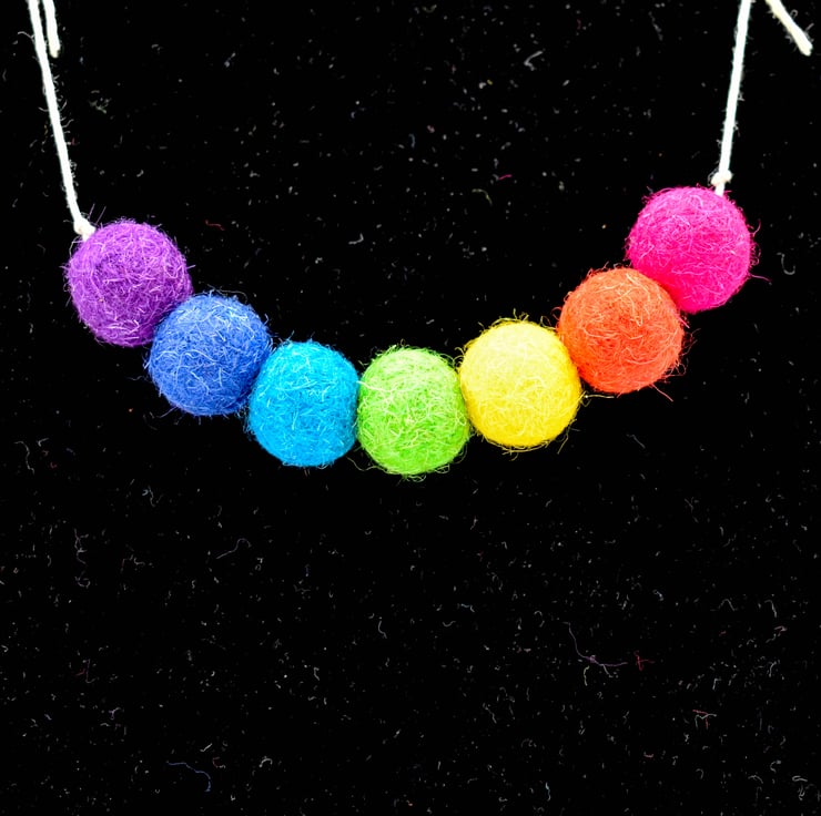 This statement necklace has been created using seven felted beads made from wool in the colours of the rainbow and strung on light grey 1mm hemp cord.