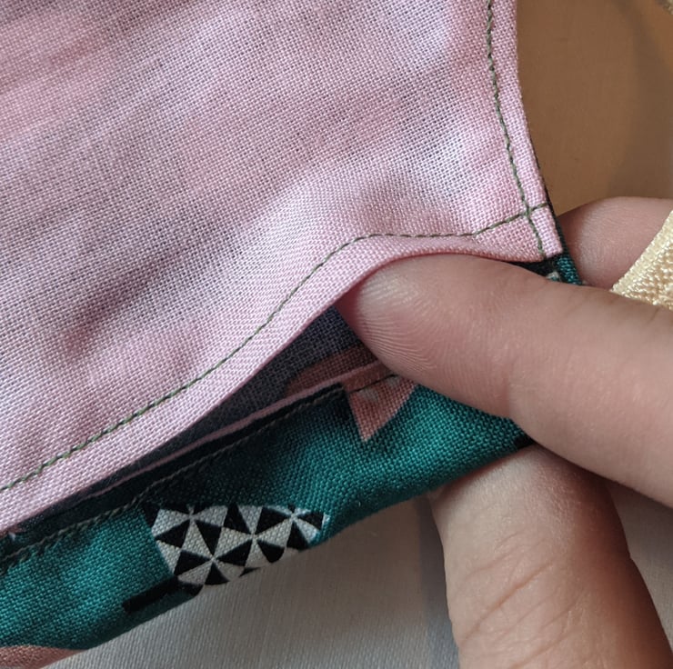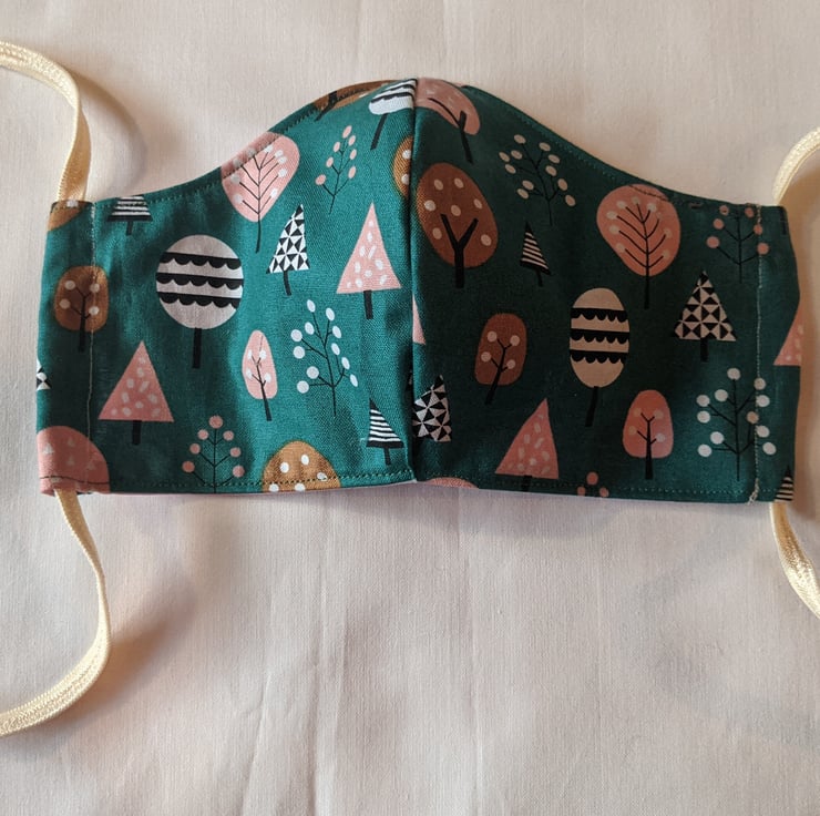 This is a face covering with elastic ties. It is made of 100% cotton with a pattern of trees in a modern design against a dark green background. It has a lining in solid pink cotton.
