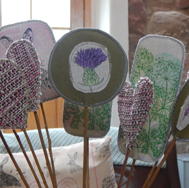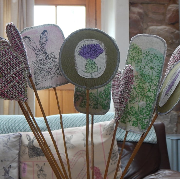 This is a bouquet of 11 fabric on willow creations. Each is double sided with interfacing for stability. They are all have running stitch and then a zig zig stitched finishing to ensure fraying is kept to a minimum. They are then hand glued onto willow which measures about 40 cm in length.